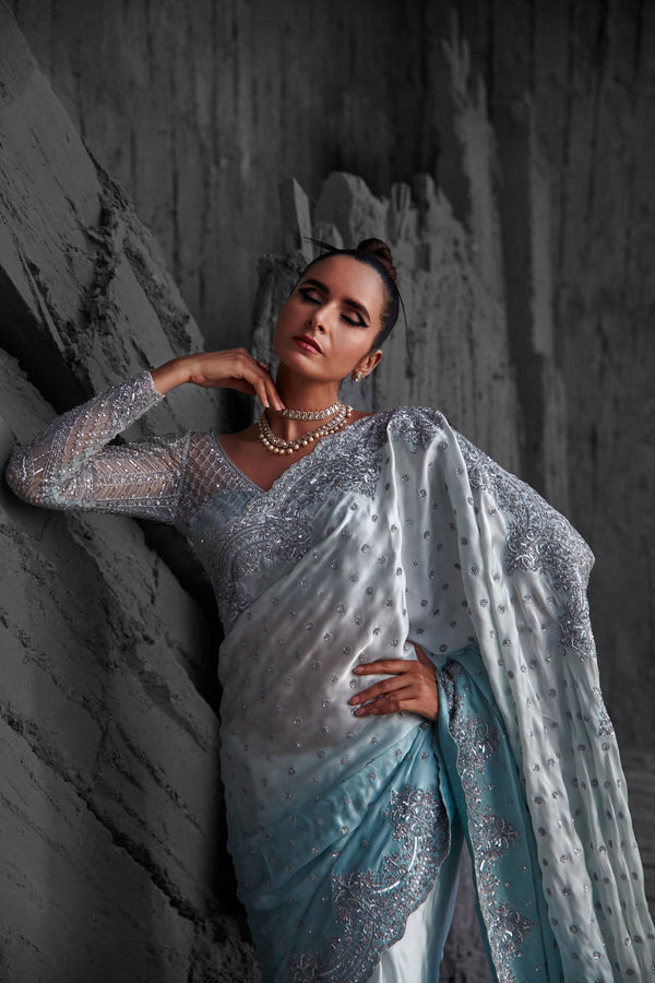 Blue Embroidered Organza Saree With Sleeveless Blouse