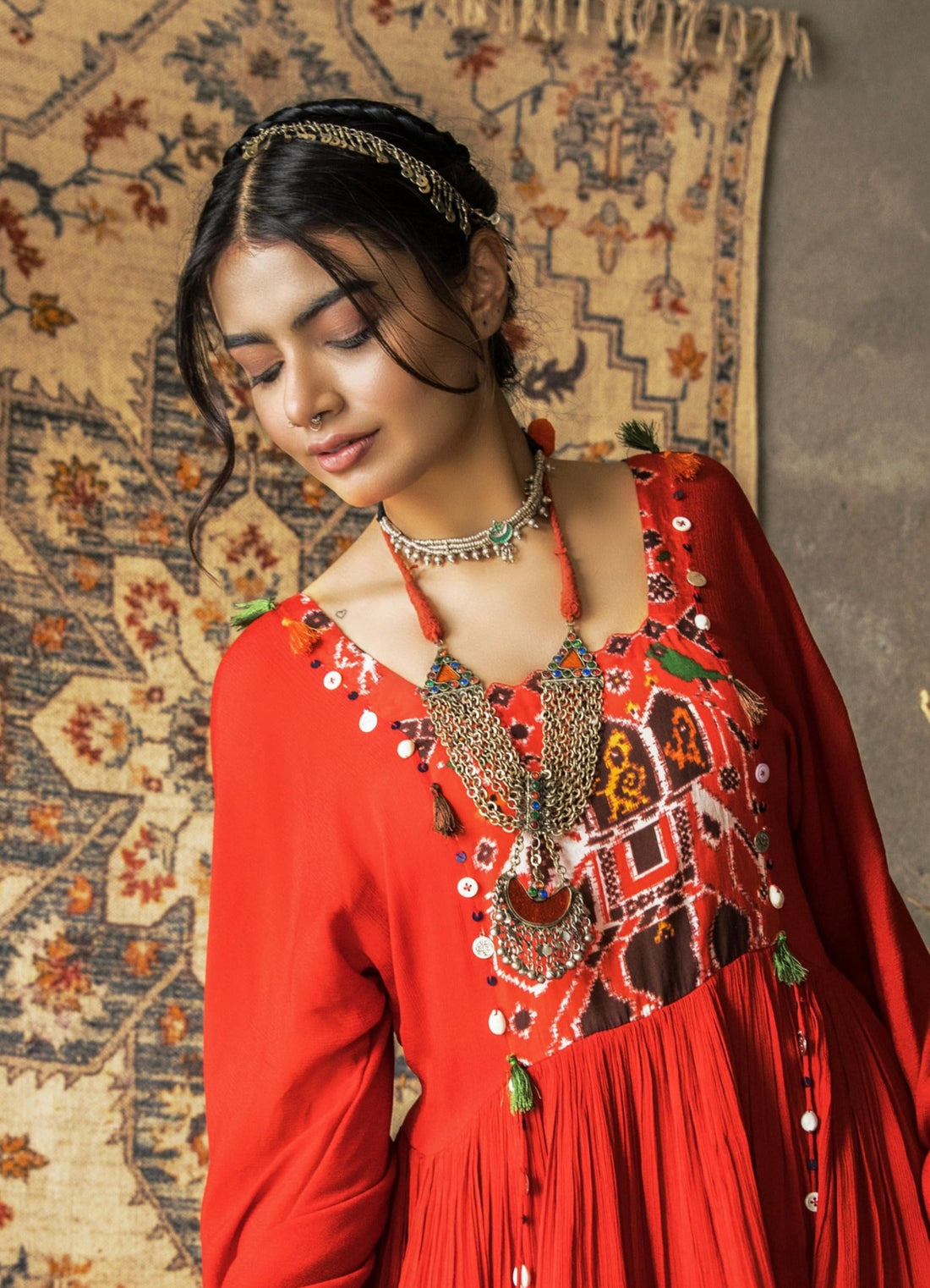 A fiery red chanderi coord set of the highest sartorial pedigree, meticulously fashioned from luminous patola, befitting attire for attending special occassions.