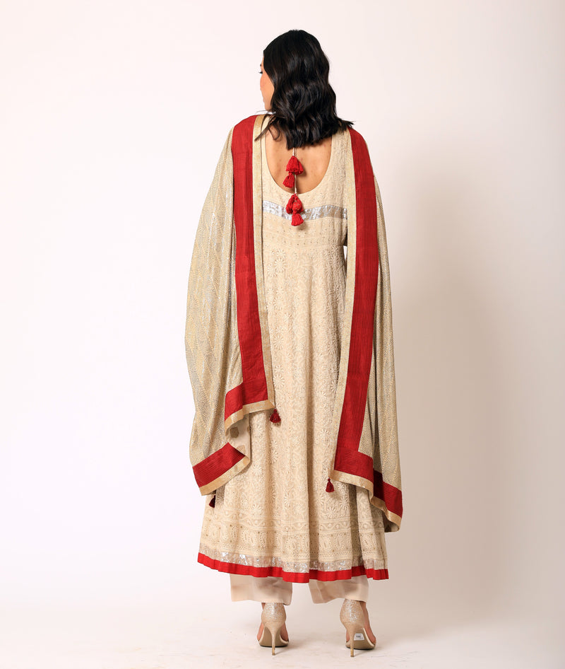 Featuring a beige anarkali in georgette base with mukaish and chikankari embroidery. It is paired with matching crepe pajama pants and a dupatta.