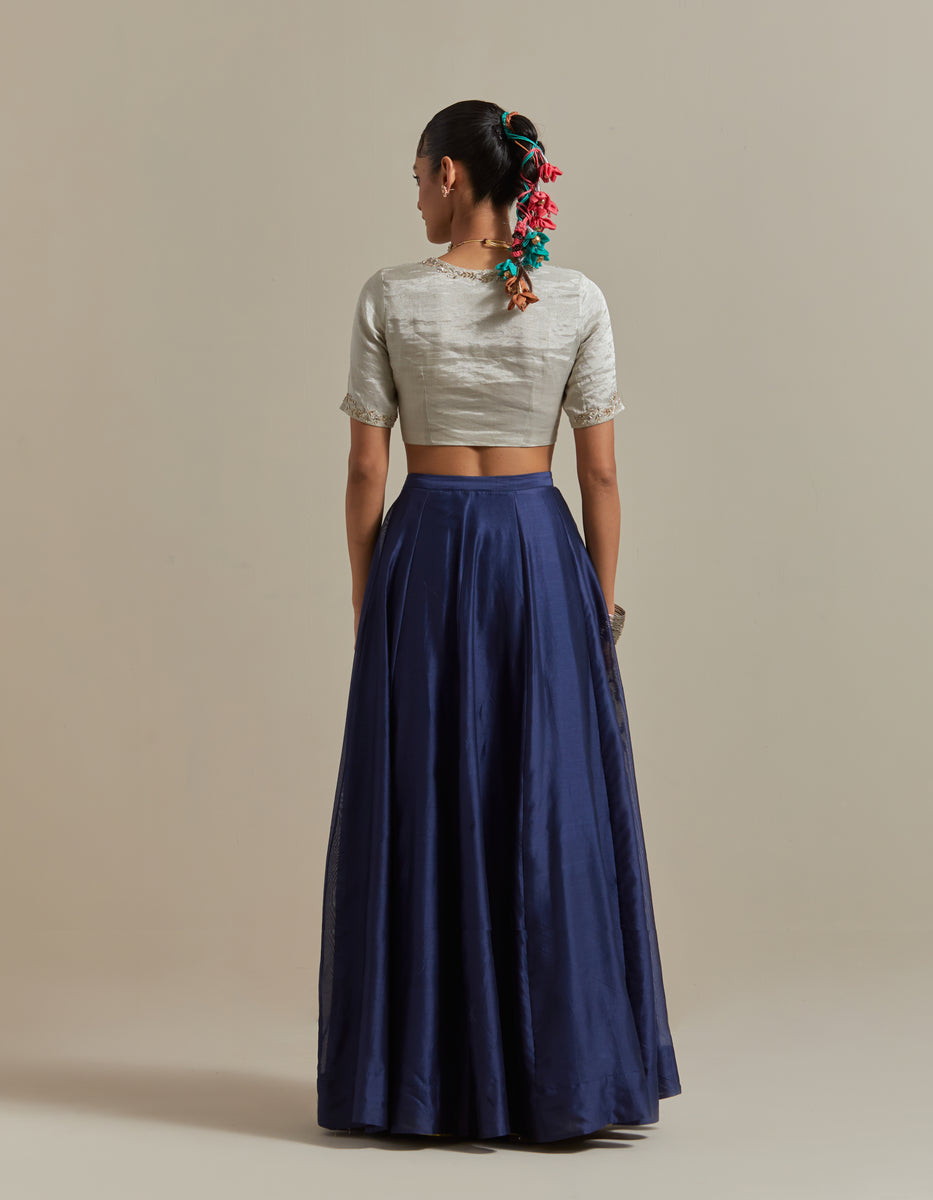 The blue chanderi skirt is beautifully complemented by the intricate zardozi embroidery on pockets that adds a touch of sophistication. its paired with an embroidered v-neck blouse in shimmery silver zari and a striped chanderi dupatta. The dupatta is adorned with silver lace details on the edges. A classic outfit that is contemporary and elegant.