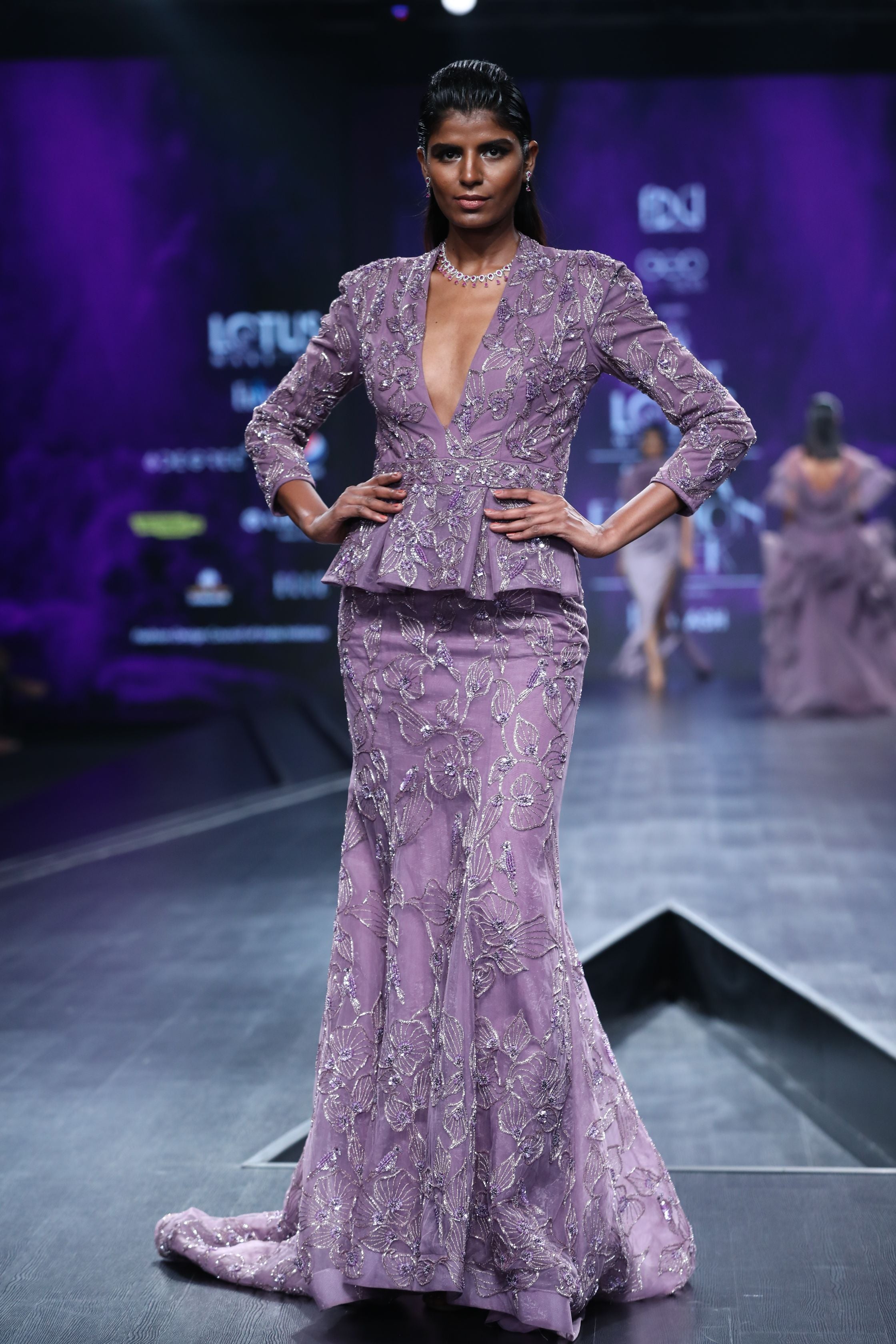 Lavender coat gown by Amit GT. This gown is made with lavender tulle, it has intricate hand embroidery all over and embroidered leaves on the sleeves.
