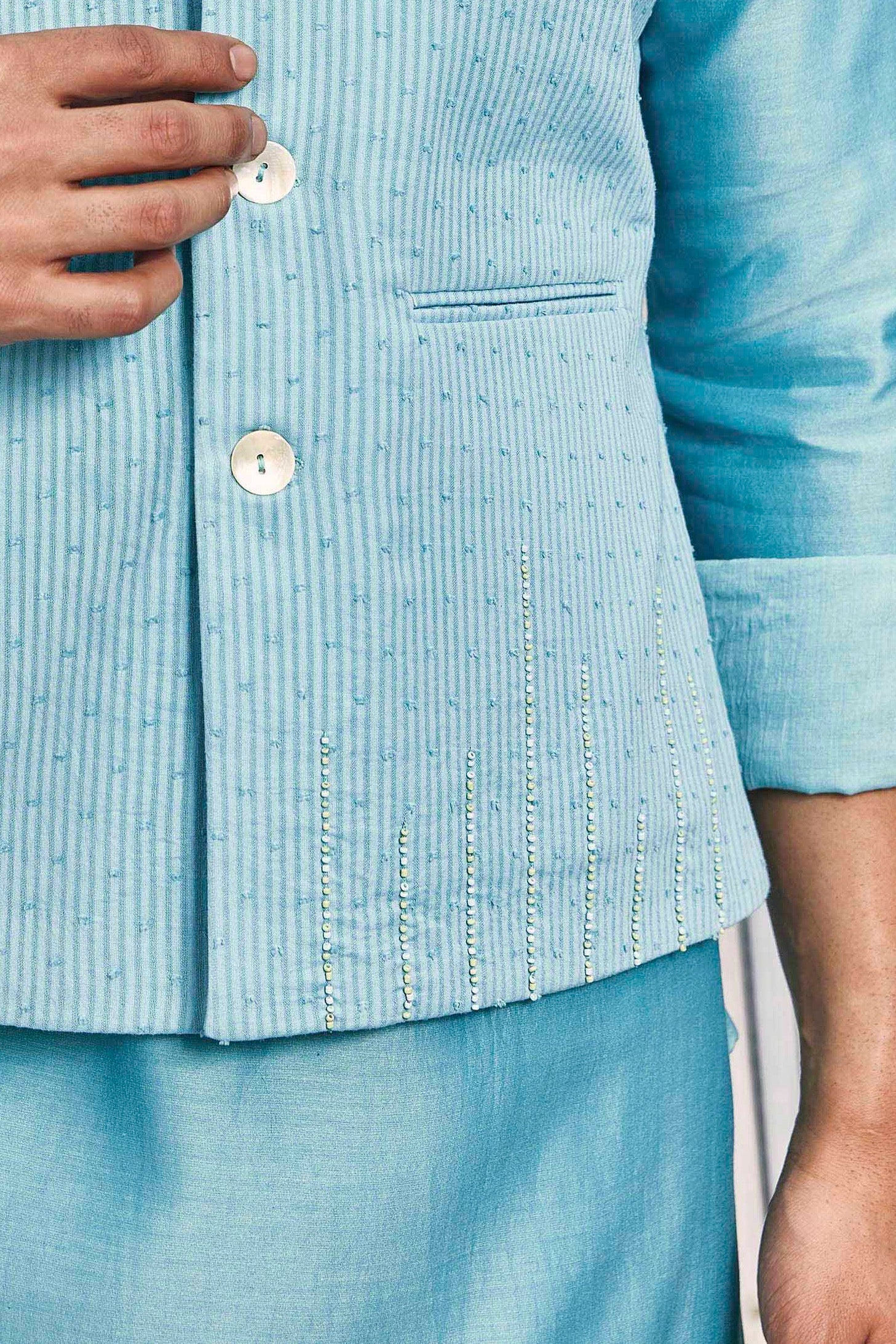 Bundi jacket in blue cotton dobby can transform any outfit into occasion wear.This jacket has an intricate dash of bead work over the right shoulder & left under pocket.
