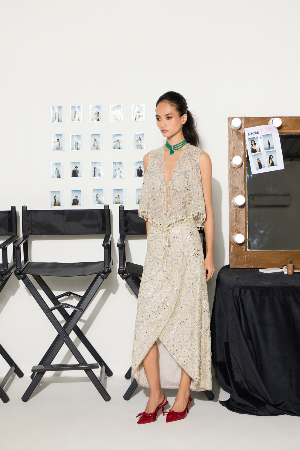 Long Sleeveless Jacket With Multicolour Brocade Pants