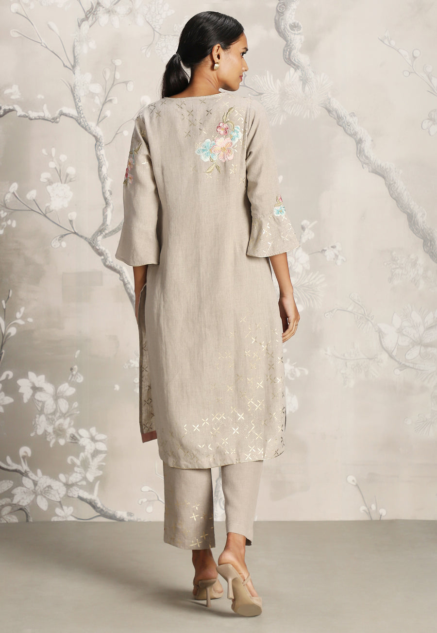 Inspired by the emblem of ceremonial festivities and the beauty that surrounds us, the resplendent range of Corsage on luxurious linen springs to life with delicate blooms embedded through intricate silk thread embroidery and finished with a repetitive motif layer of gold that gleams to the light-elevating style with an elegance that you richly deserve.