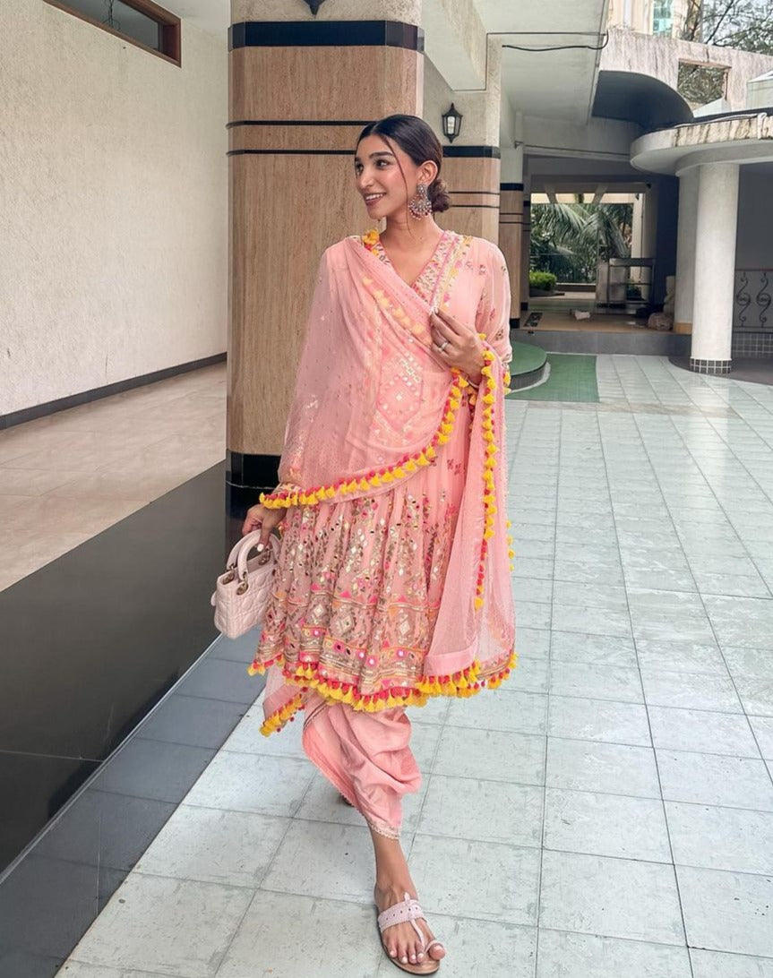 The priyal anarkali dhoti set is a testament to the craftsmanship and artistry involved in its creation. Skilled artisans have painstakingly embellished the fabric with exquisite designs, using a combination of traditional hand embroidery techniques and precise machine stitching. This intricate embroidery enhances the beauty of the dress, making it truly unique.