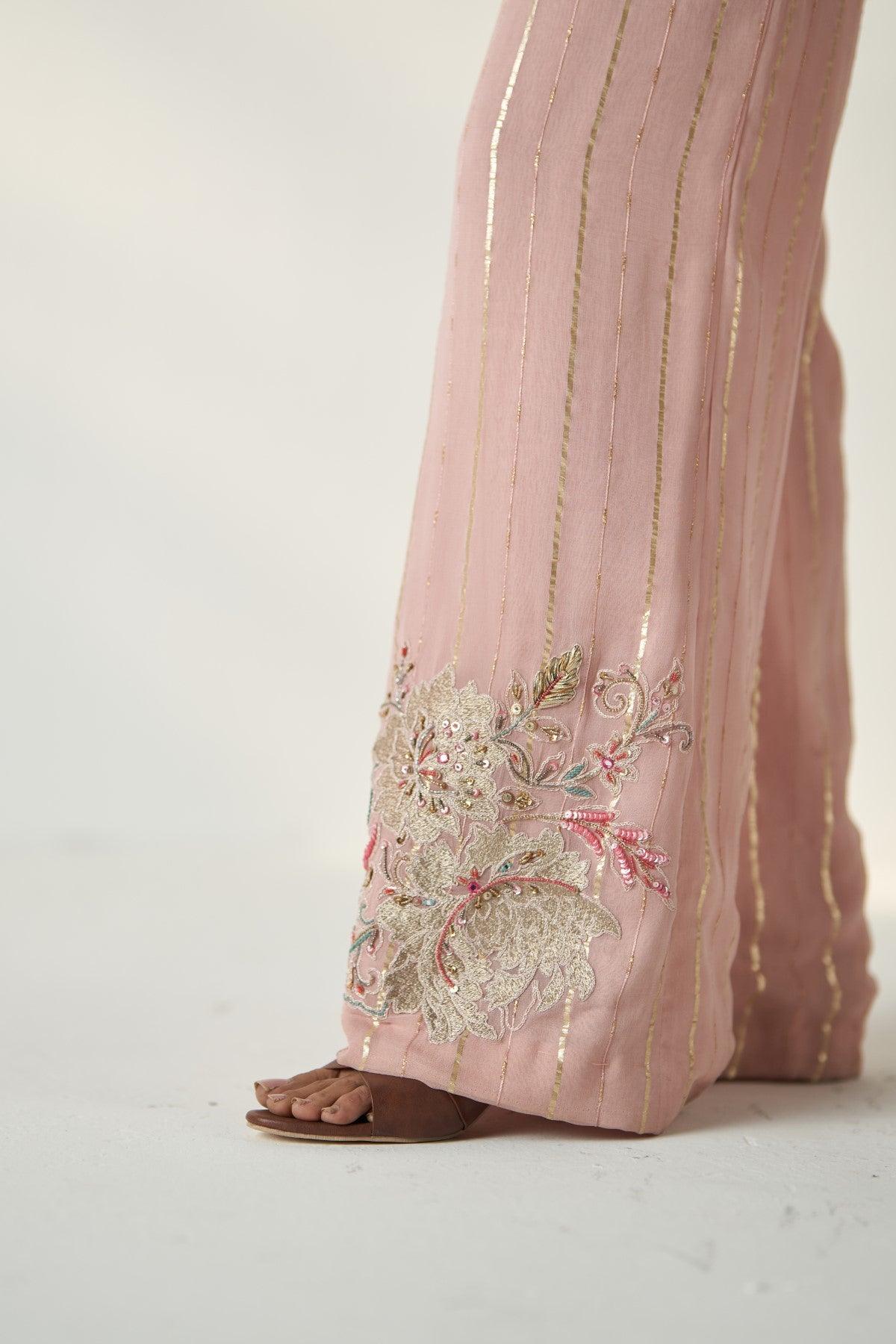 This set includes a shirt paired with pants. The shirt features intricate detailing on the collar, cuffs, and slits. The pants also have detailing near the waistband and edges.