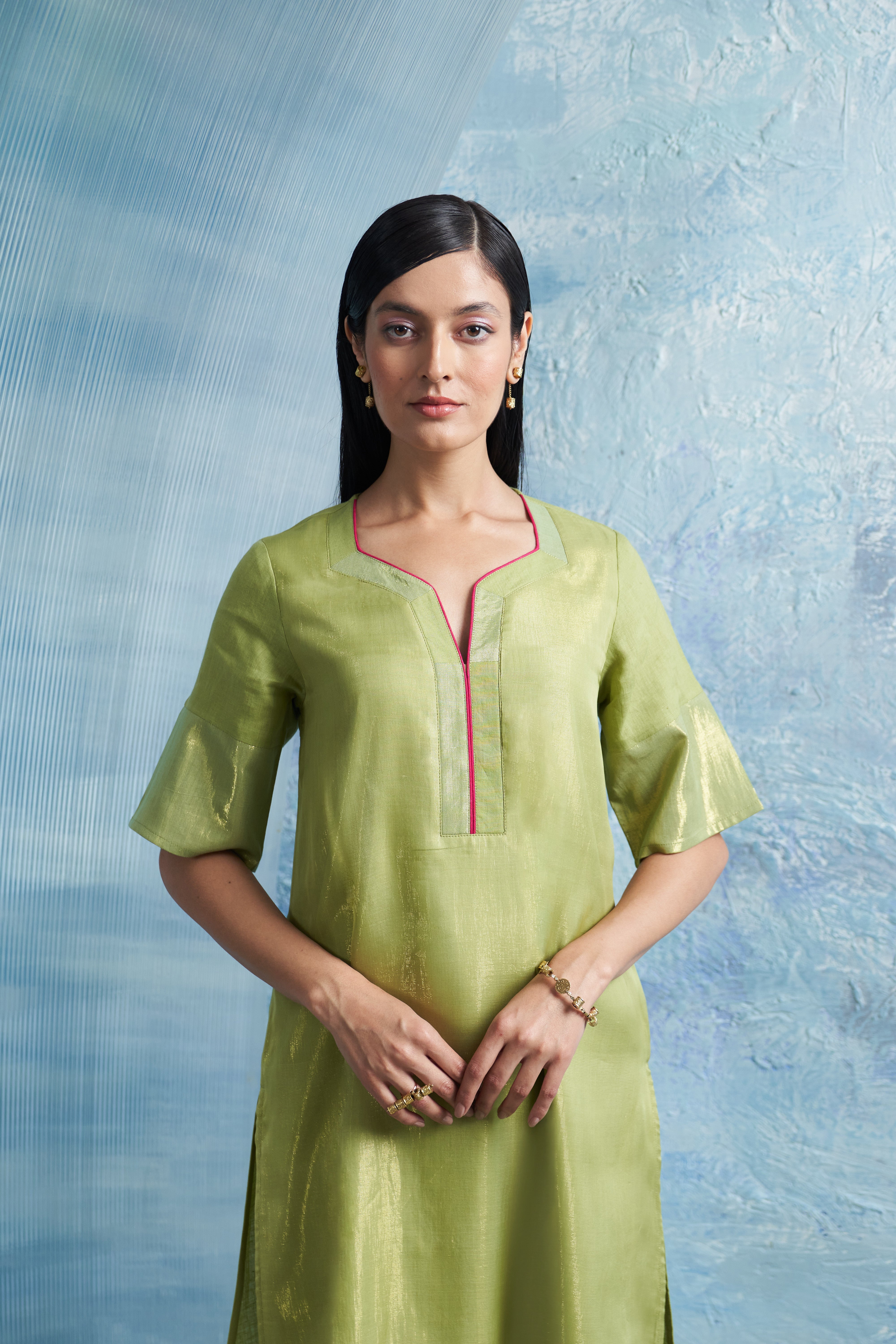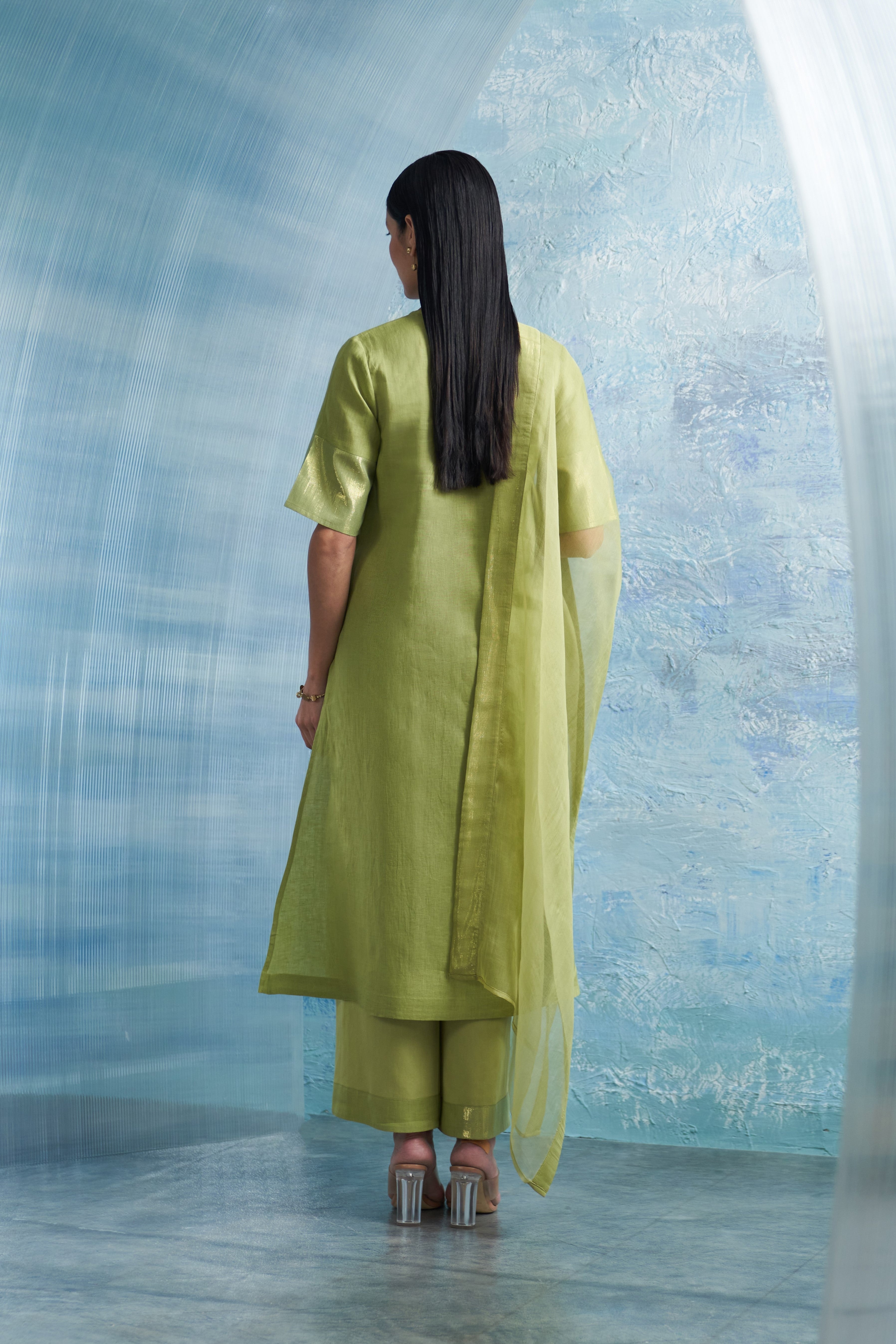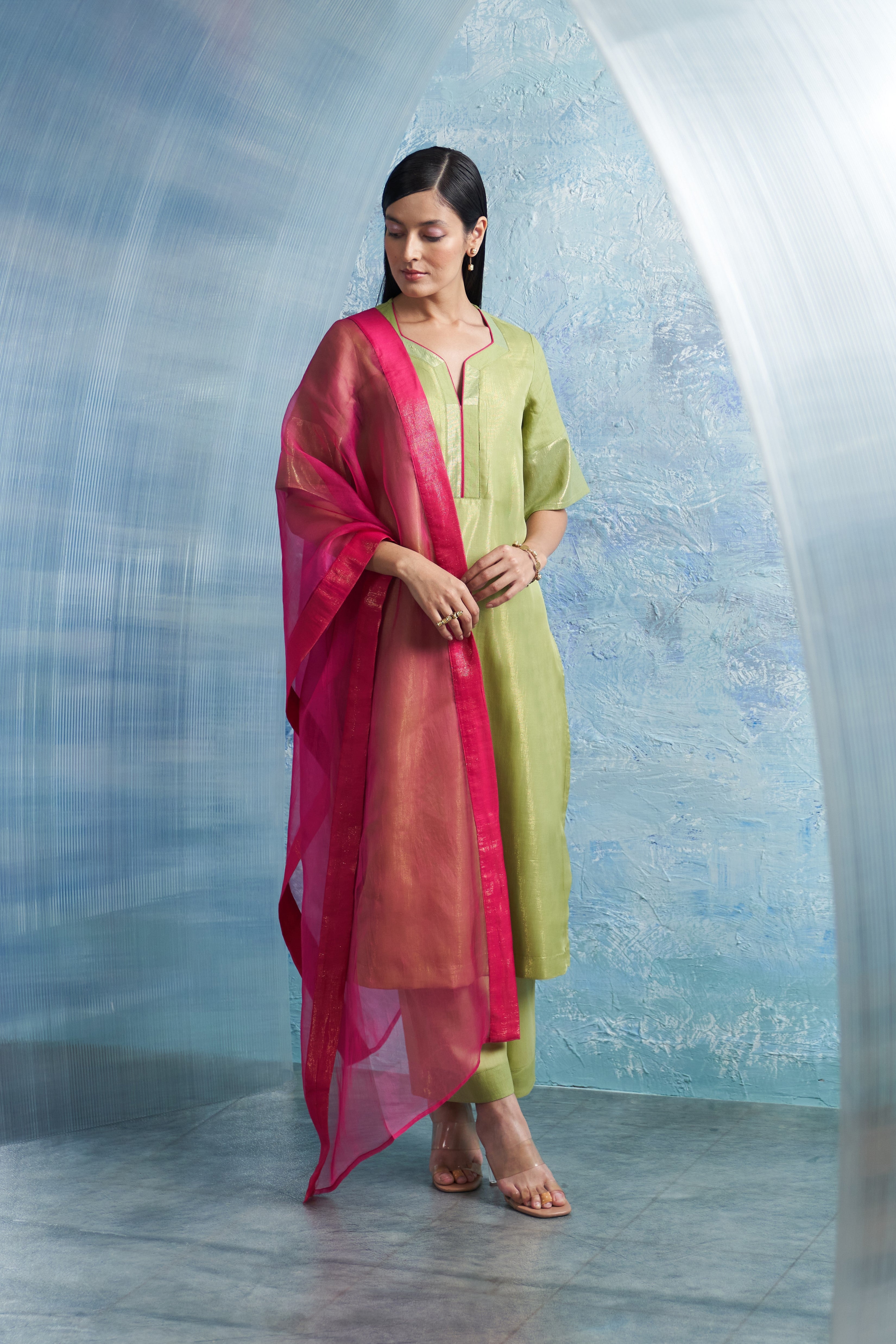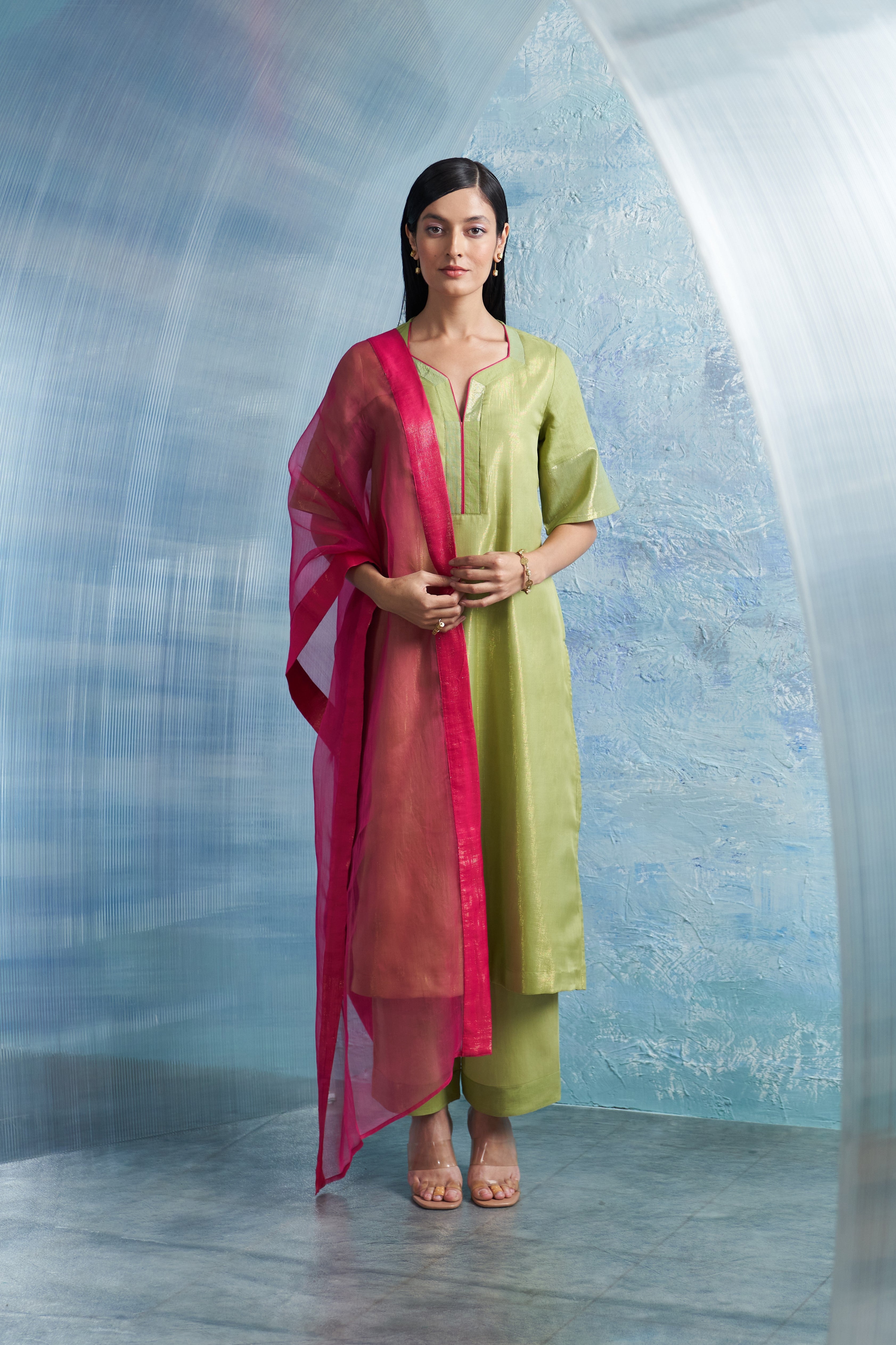 Featuring an edgy neckline with striking contrast detailing, this A-line kurta is a versatile addition to any wardrobe.Paired with elasticated flowy cotton satin pants and a sheer organza dupatta, it exudes sophistication for both casual and formal occasions.