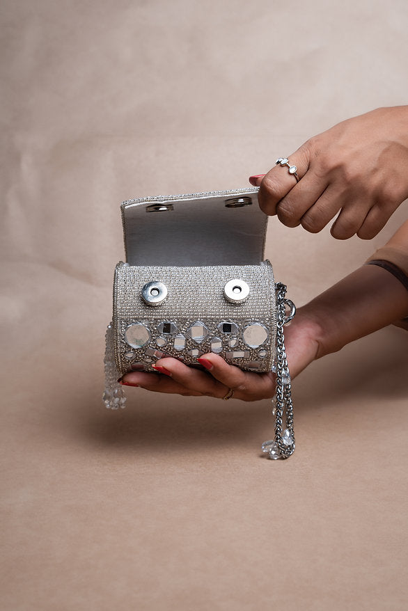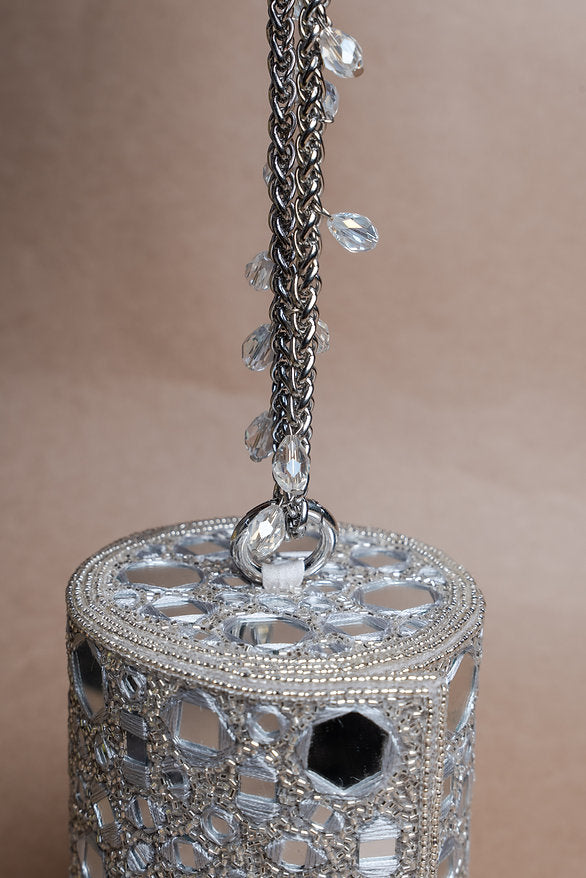 A sleek cylindrical accessory featuring a stunning mix of shimmering mirrors and intricate abla work in a lustrous silver hue. Perfect for adding a touch of glamour to any special occasion, this potli blends traditional craftsmanship with a modern, eye-catching design.