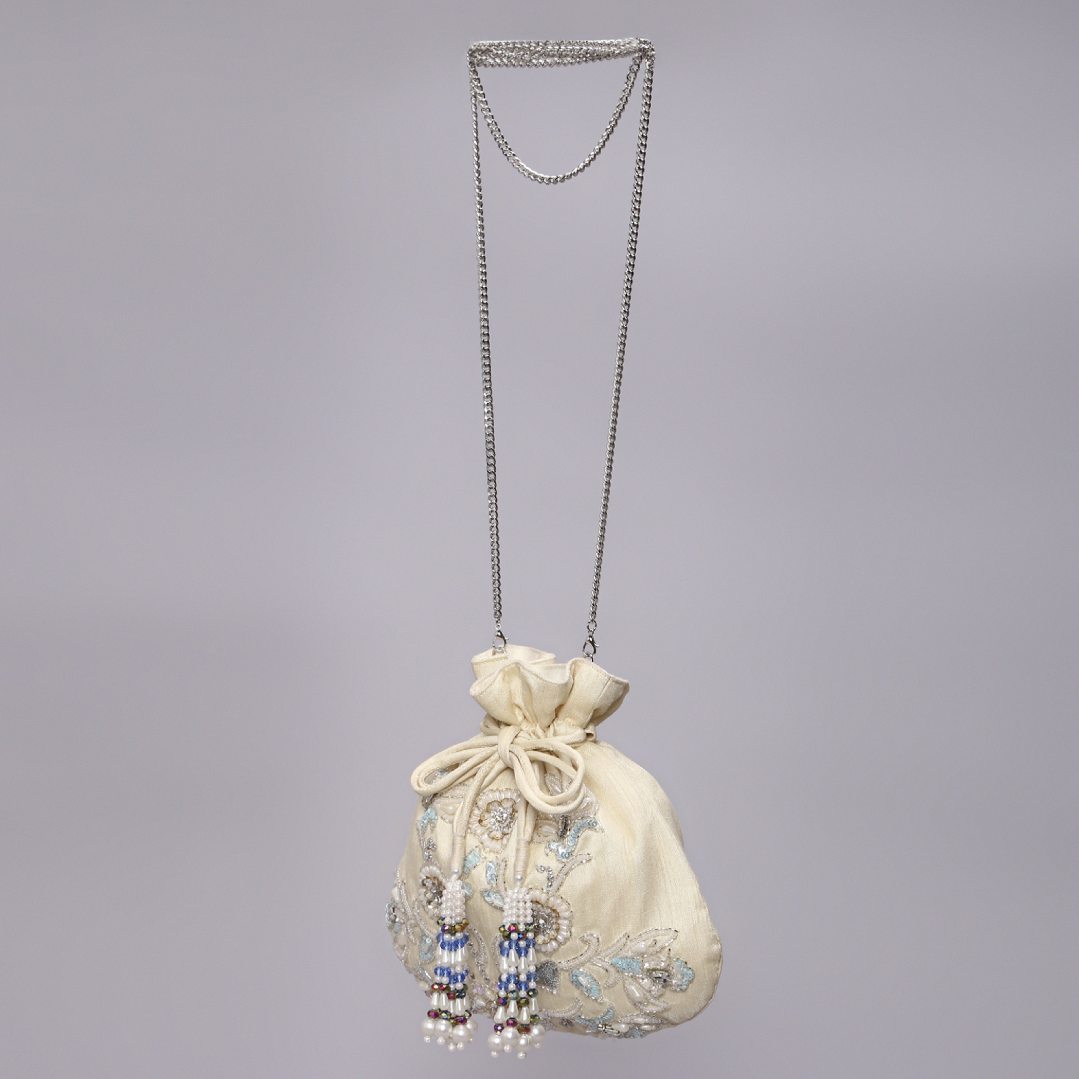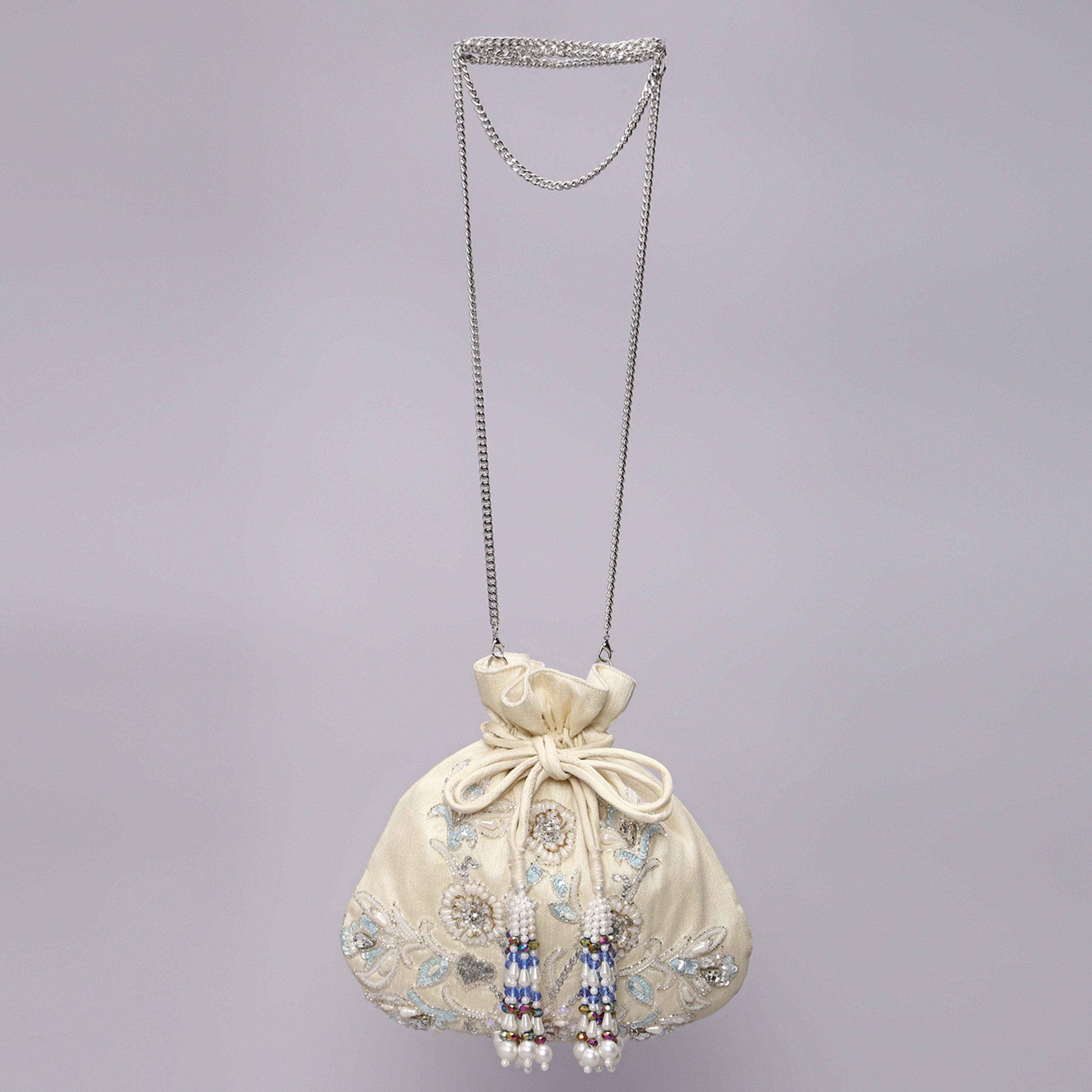Our Aparajita (meaning something you cant win) potli named after the beautiful blue flower. here to win your hearts with its baroque embroidery with the dynamic dual embroidery of Aari and Zardosi work running through its surface of dupion silk. It will definitely draw any crowd towards it. The silver toned metal chain sling adds to its chic look.