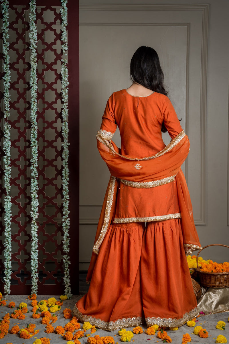Radiate warmth and elegance this wedding season in this stunning rust-orange sharara set paired with an intricately embroidered Dupatta. Sharara set and dupatta are embellished with intricate embroidery, laces and sequins.