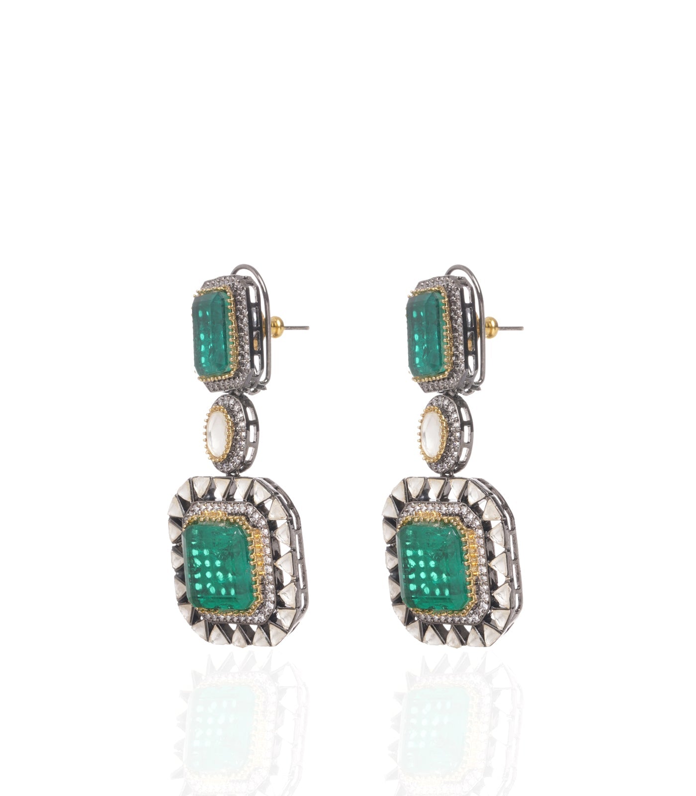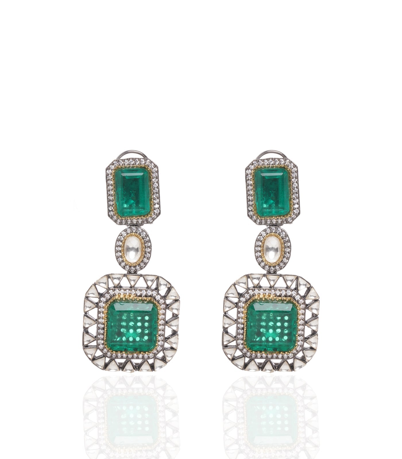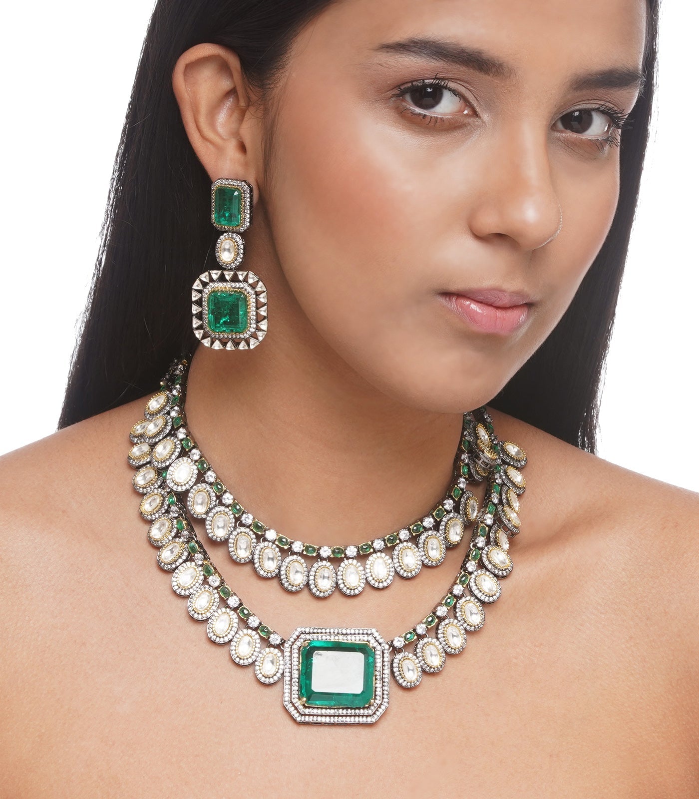 STONE SETTING: KUNDAN , ZIRCON AND GREEN ONYX FINISH: GOLD PLATED DROP: DORI: YES LENGTH: 9.0 IN WIDTH: 2.4 IN LENGTH: EARRING 2.4 IN WIDTH: EARRING 1.2 IN