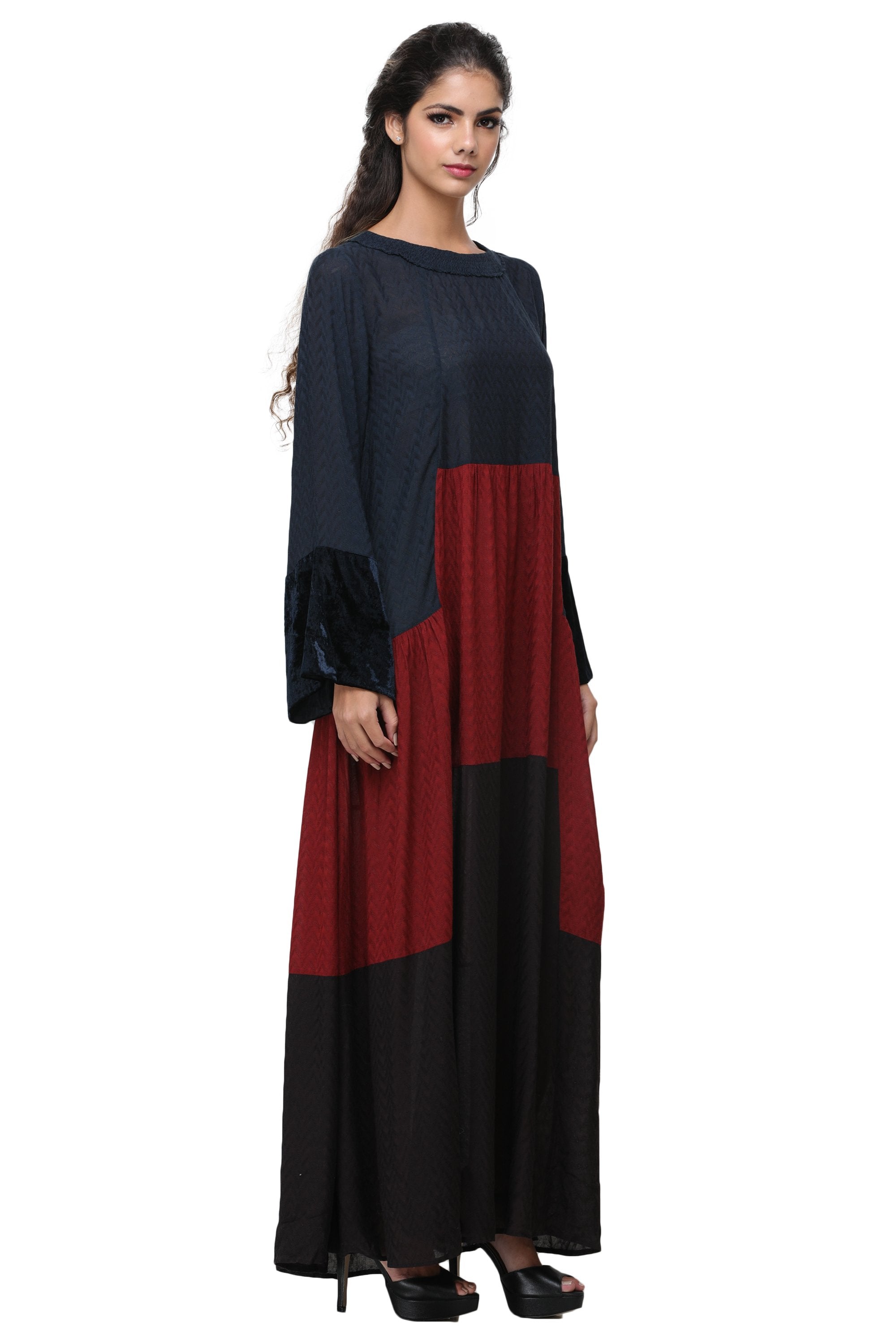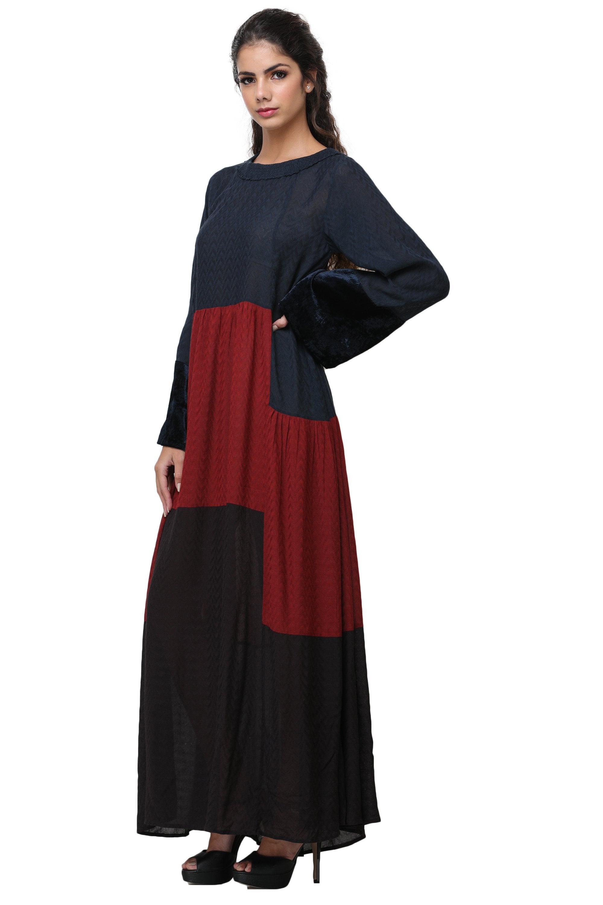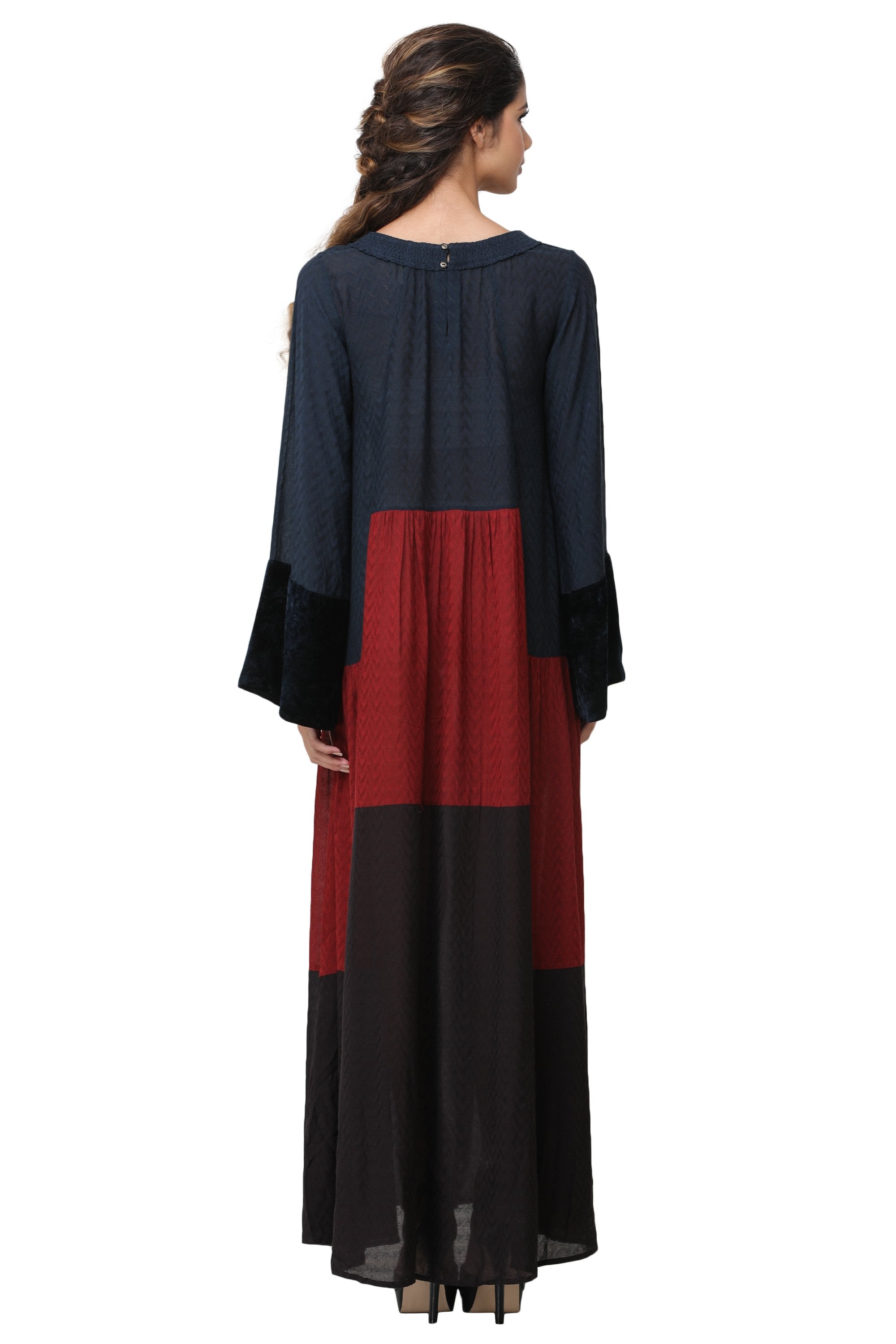 A deep navy blue, deep red and brown chevron fabric maxi with velvet embroidered border on sleeve. You can style this with some chunky silver jewellery and an oversized handbag.