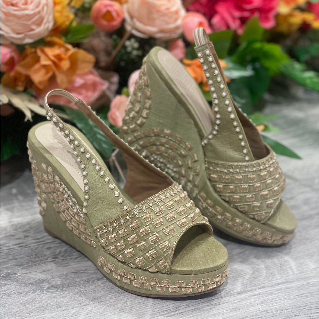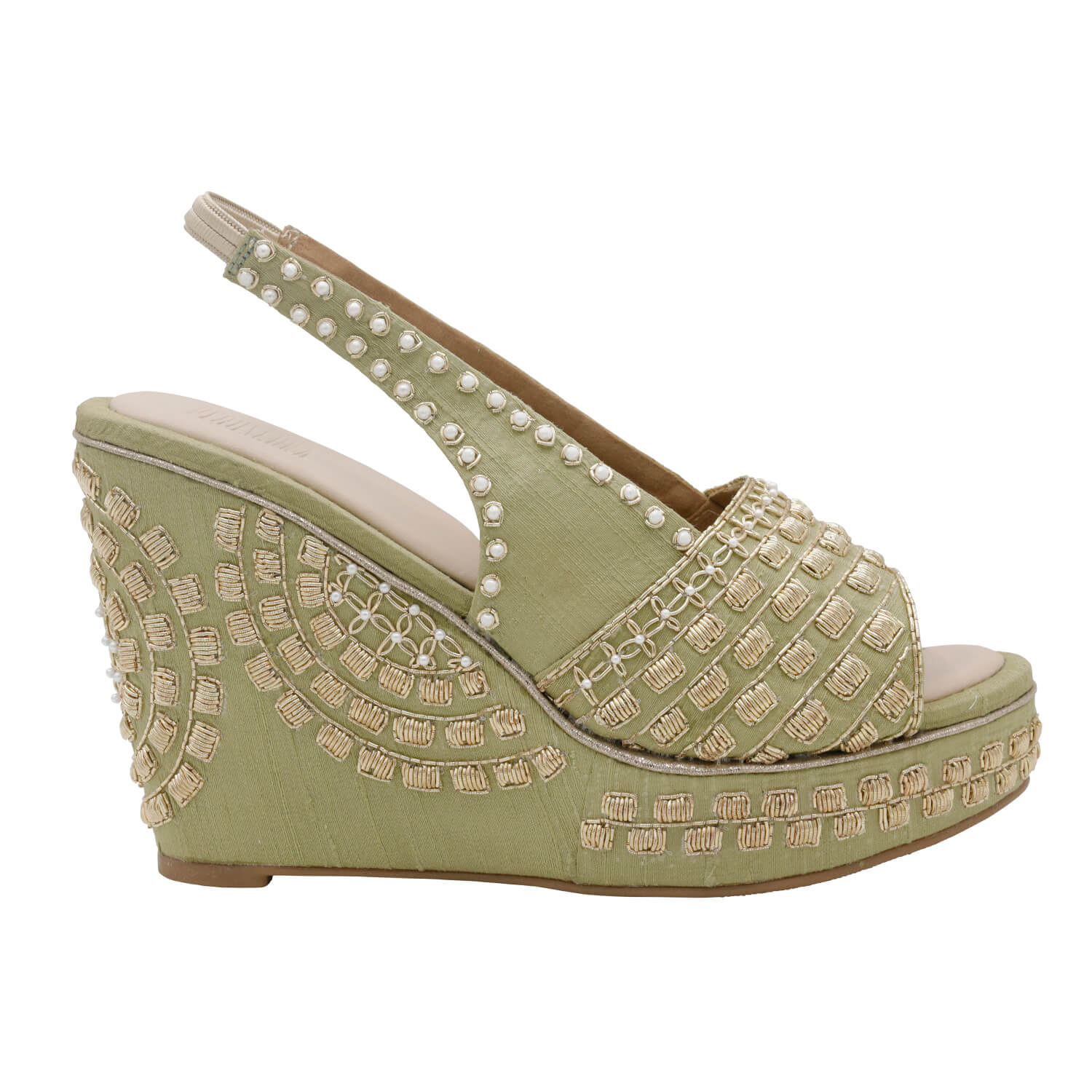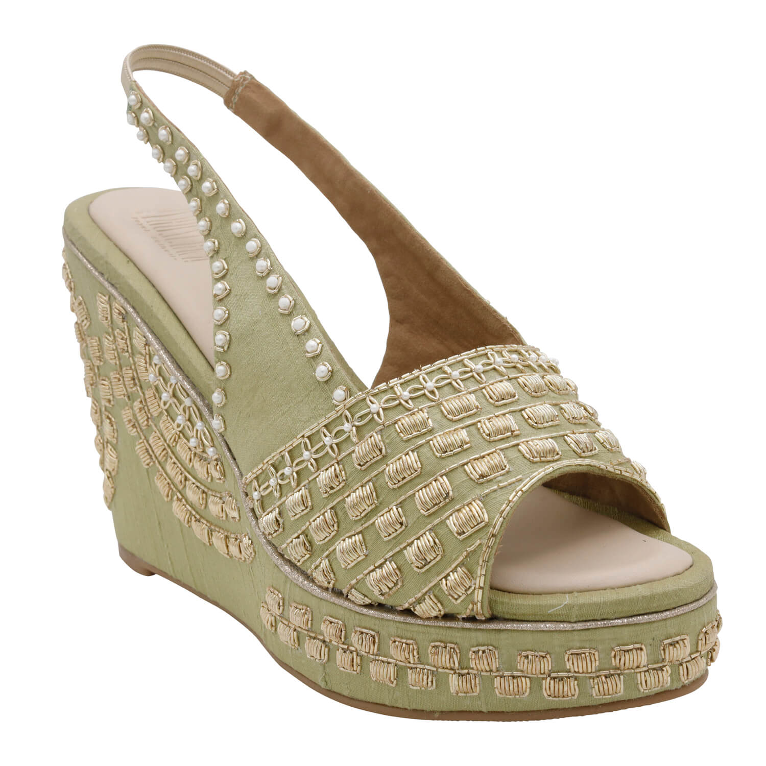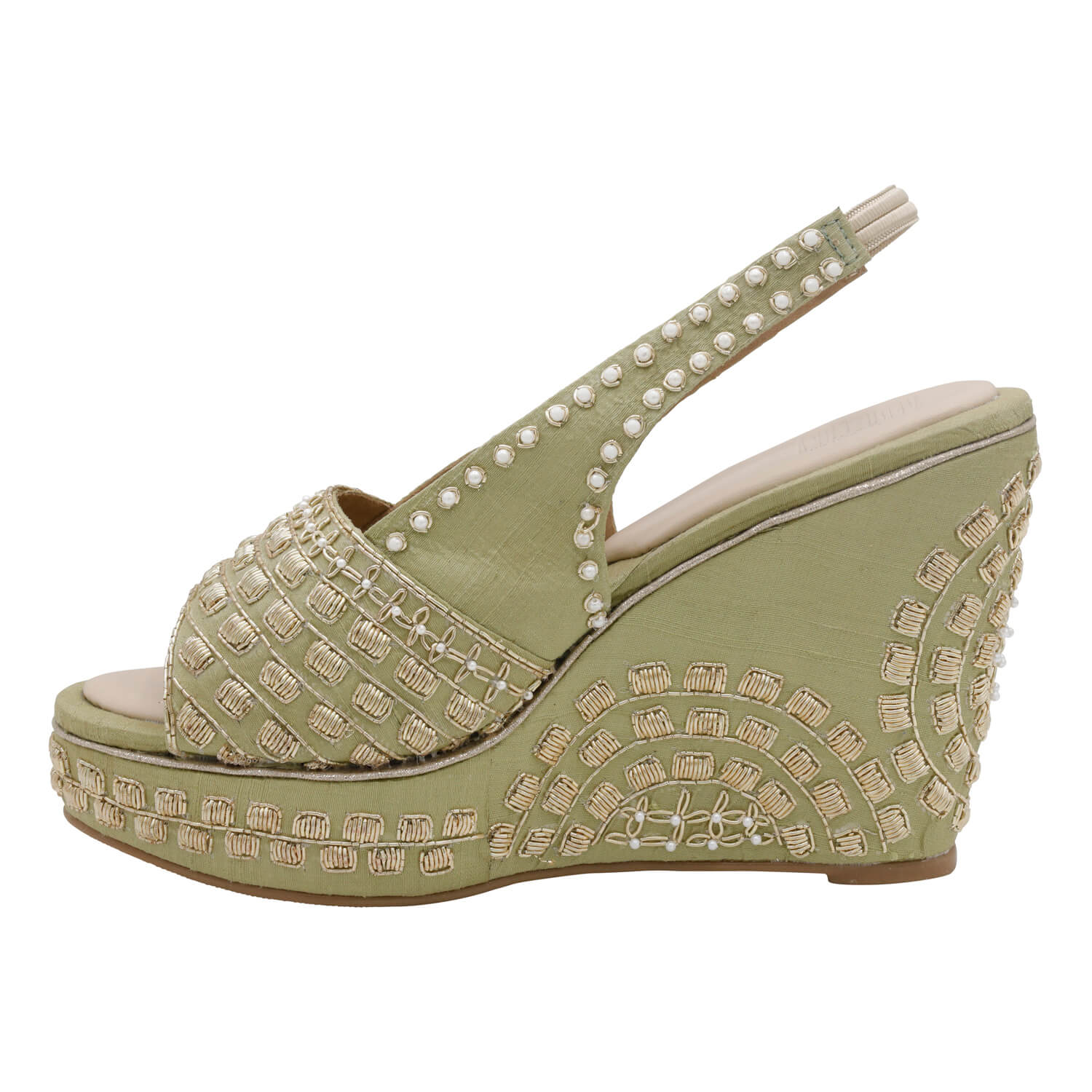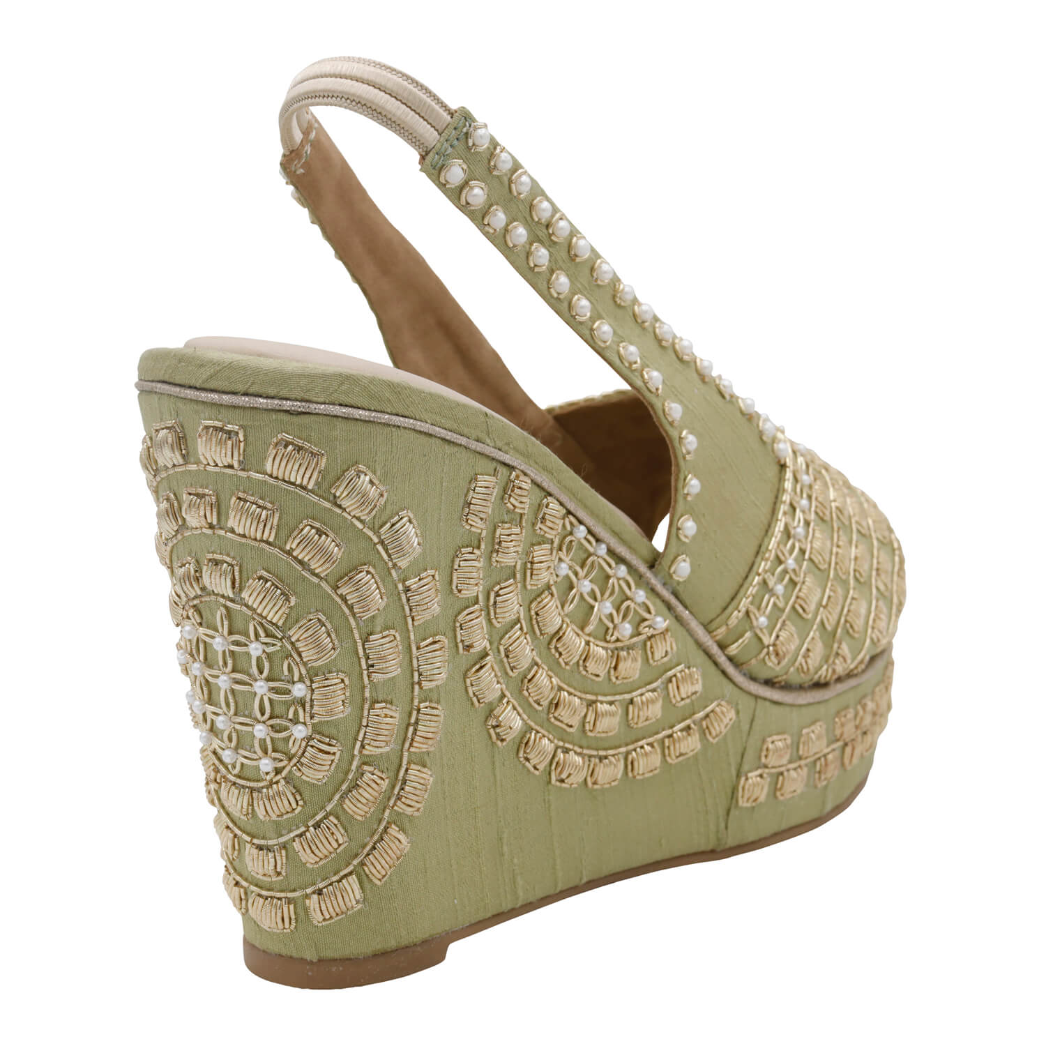 Sage green rawsilk peep toe sling pack wedges with beautiful gold zardozi and pearl embroidery on the upper and wedge.
