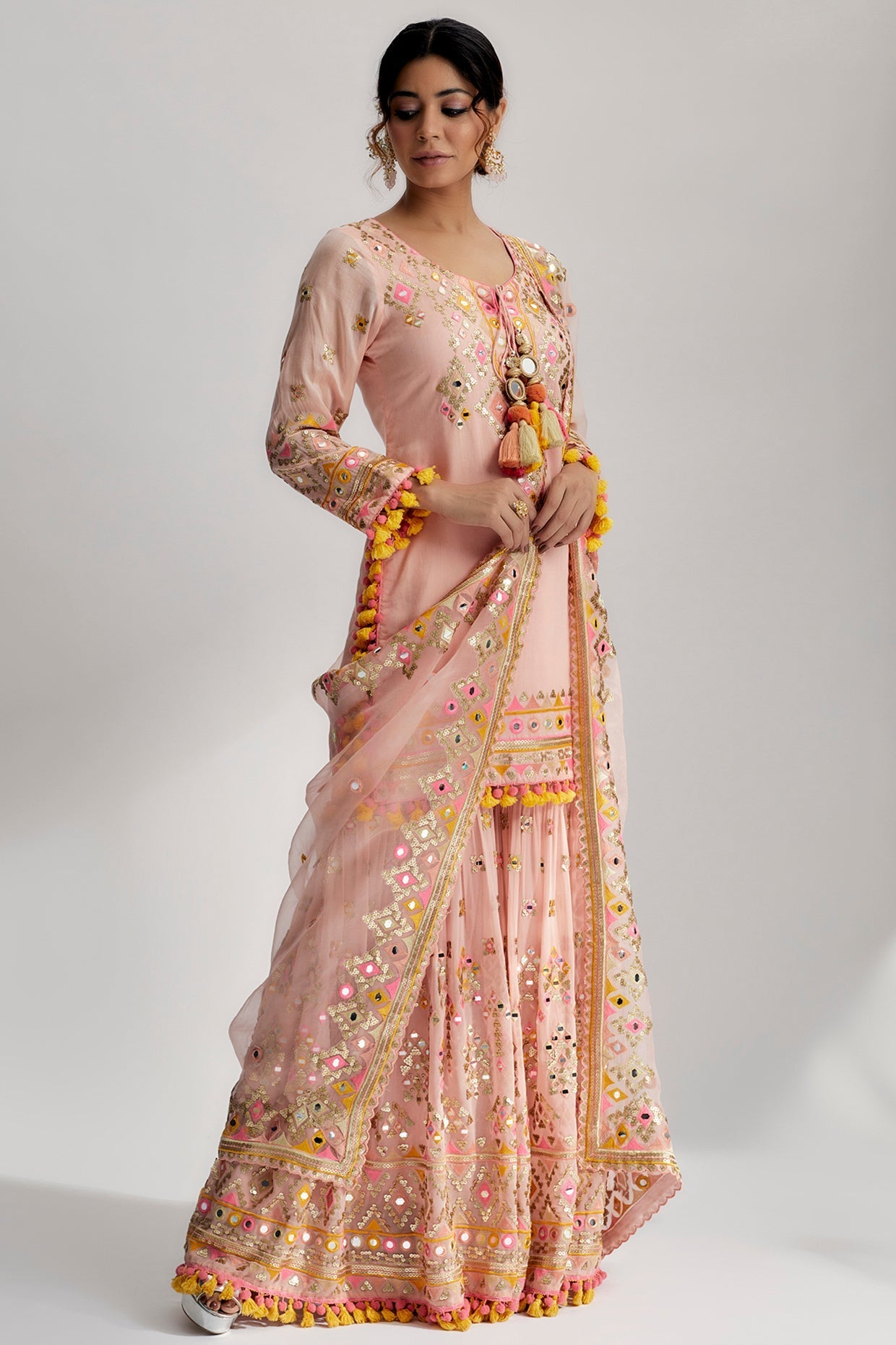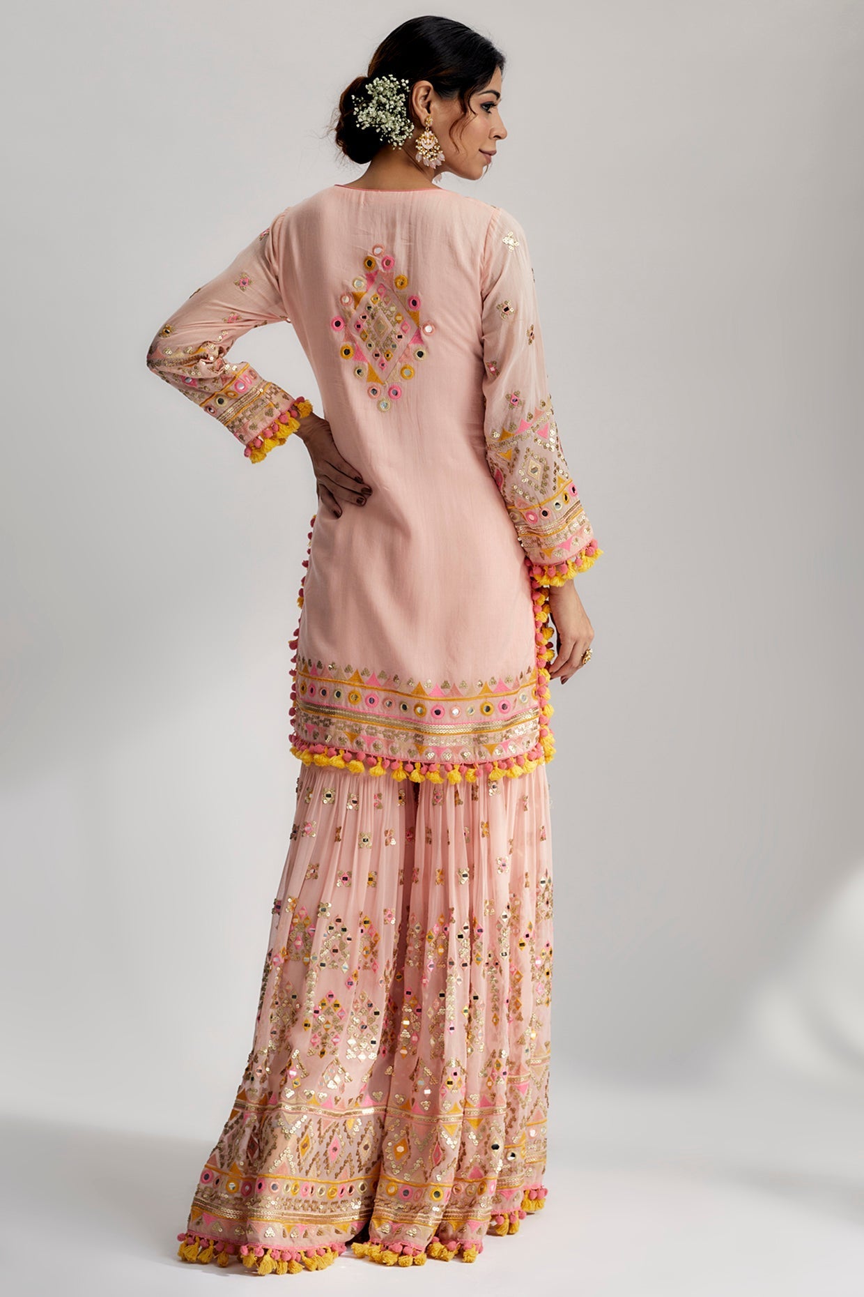 The Friya Short Kurta Sharara Set is a stunning ensemble that combines traditional charm with contemporary style. Crafted with exquisite attention to detail, this set is a true masterpiece.