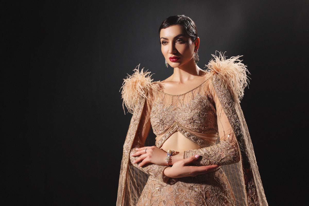Golden Hand Embroidery Lehenga Set With Hood And Feathers