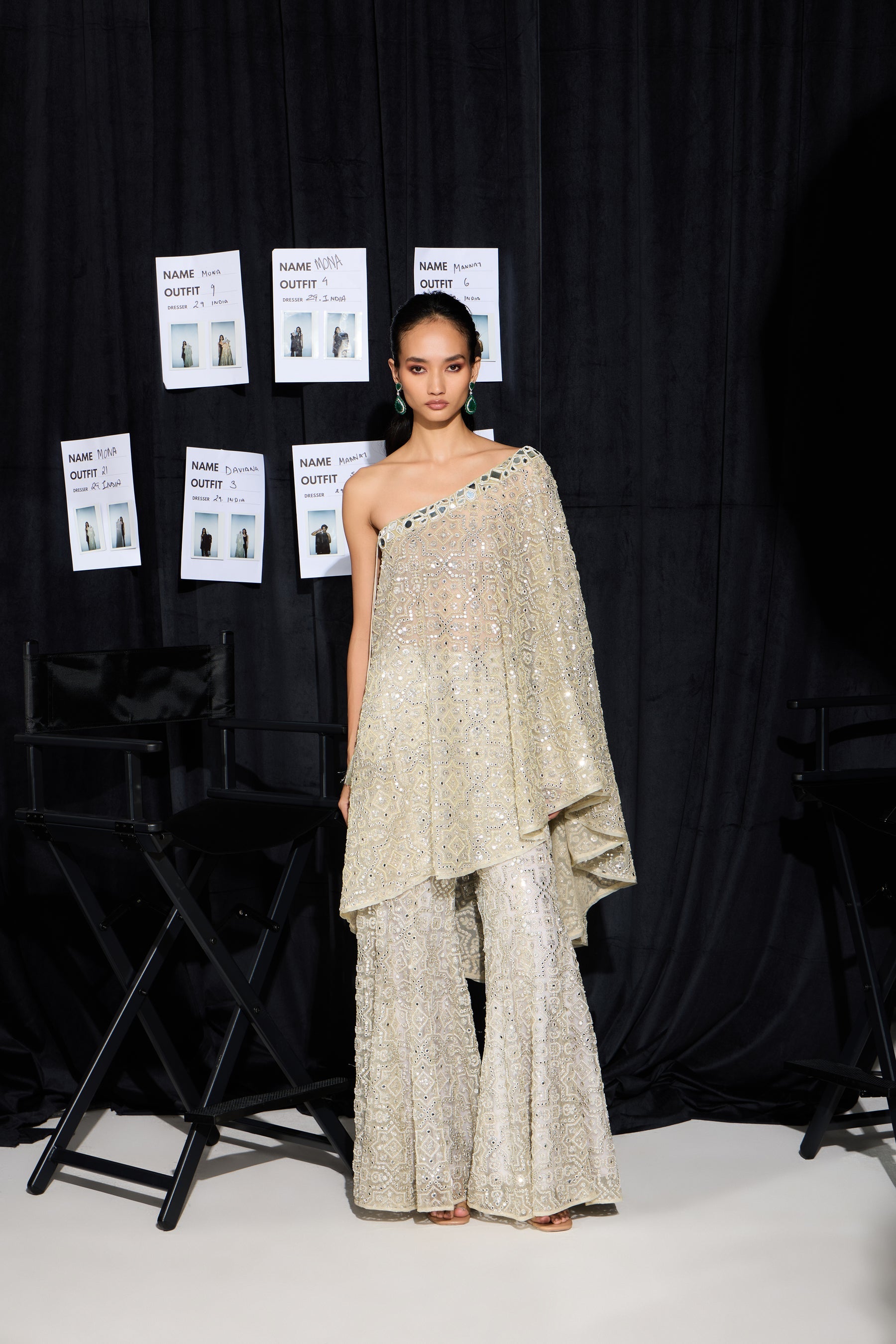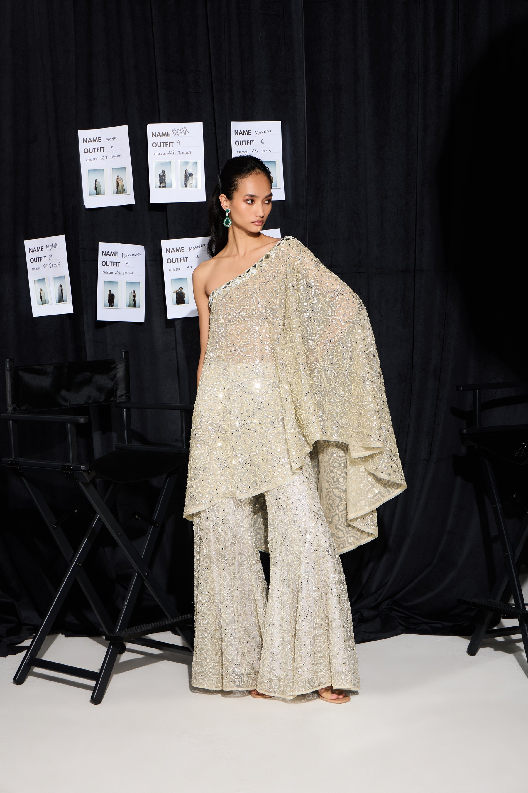 Elevate your style with this statement-making hexagon one shoulder cape. It is embellished with mirrorwork and beadwork.