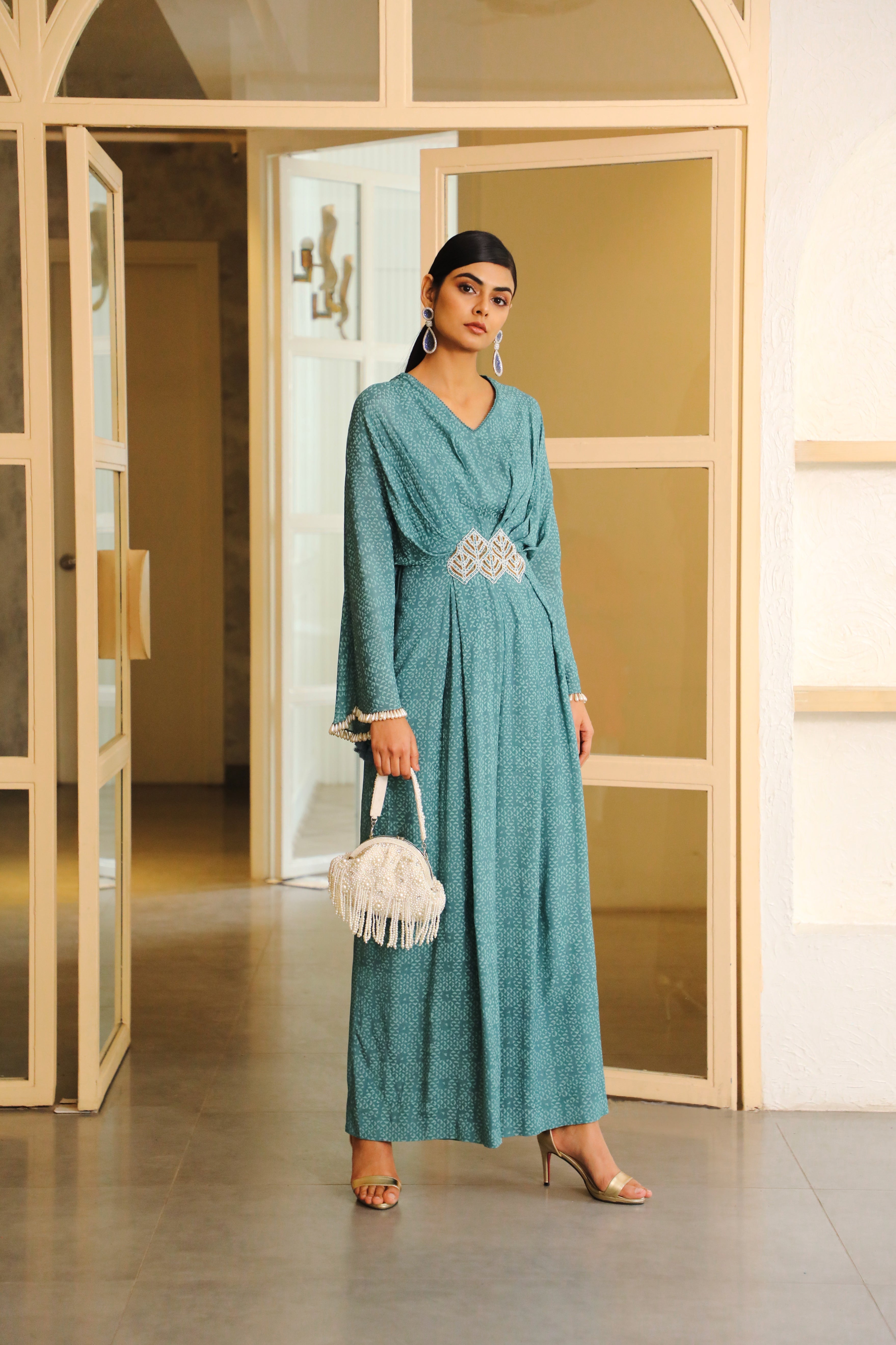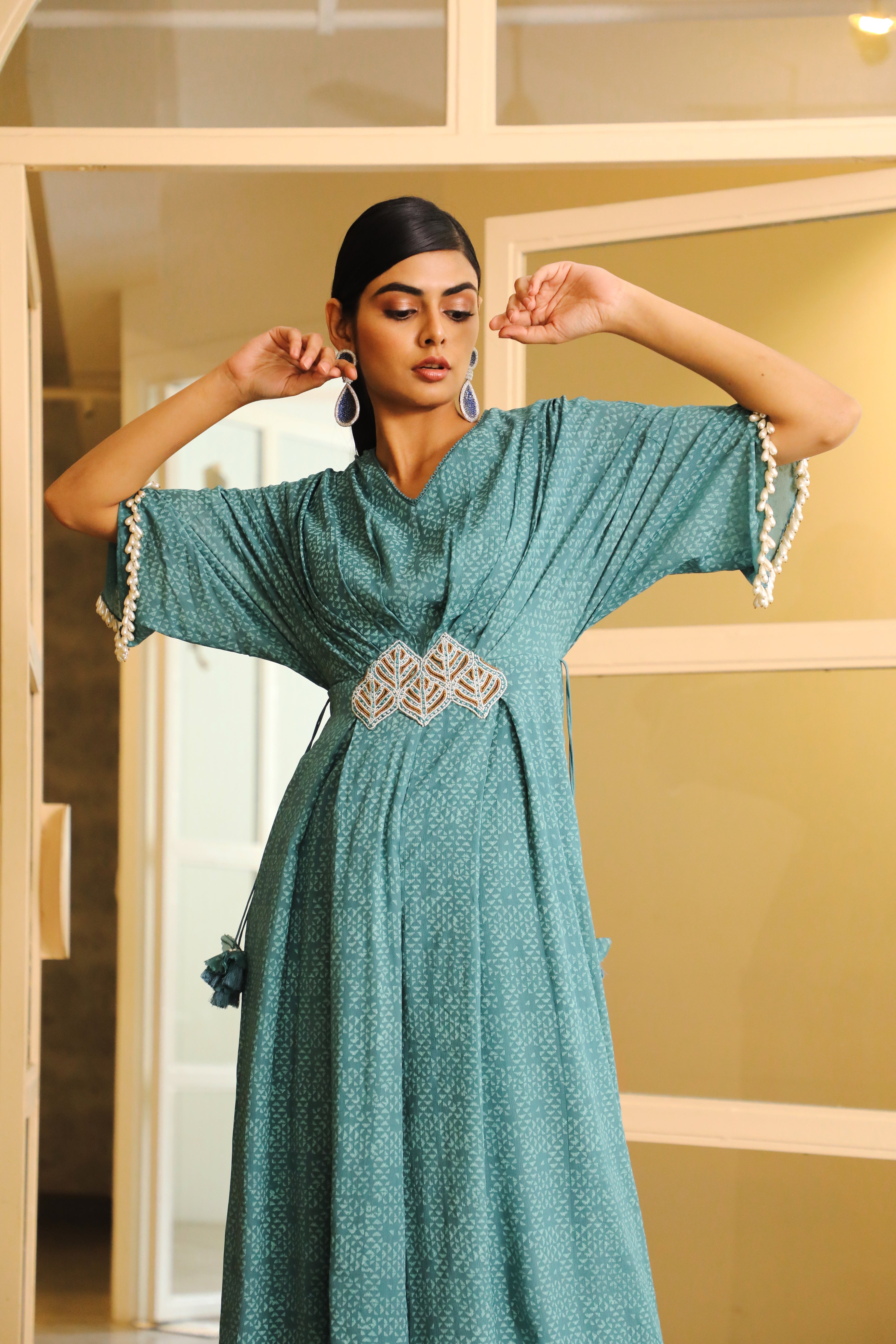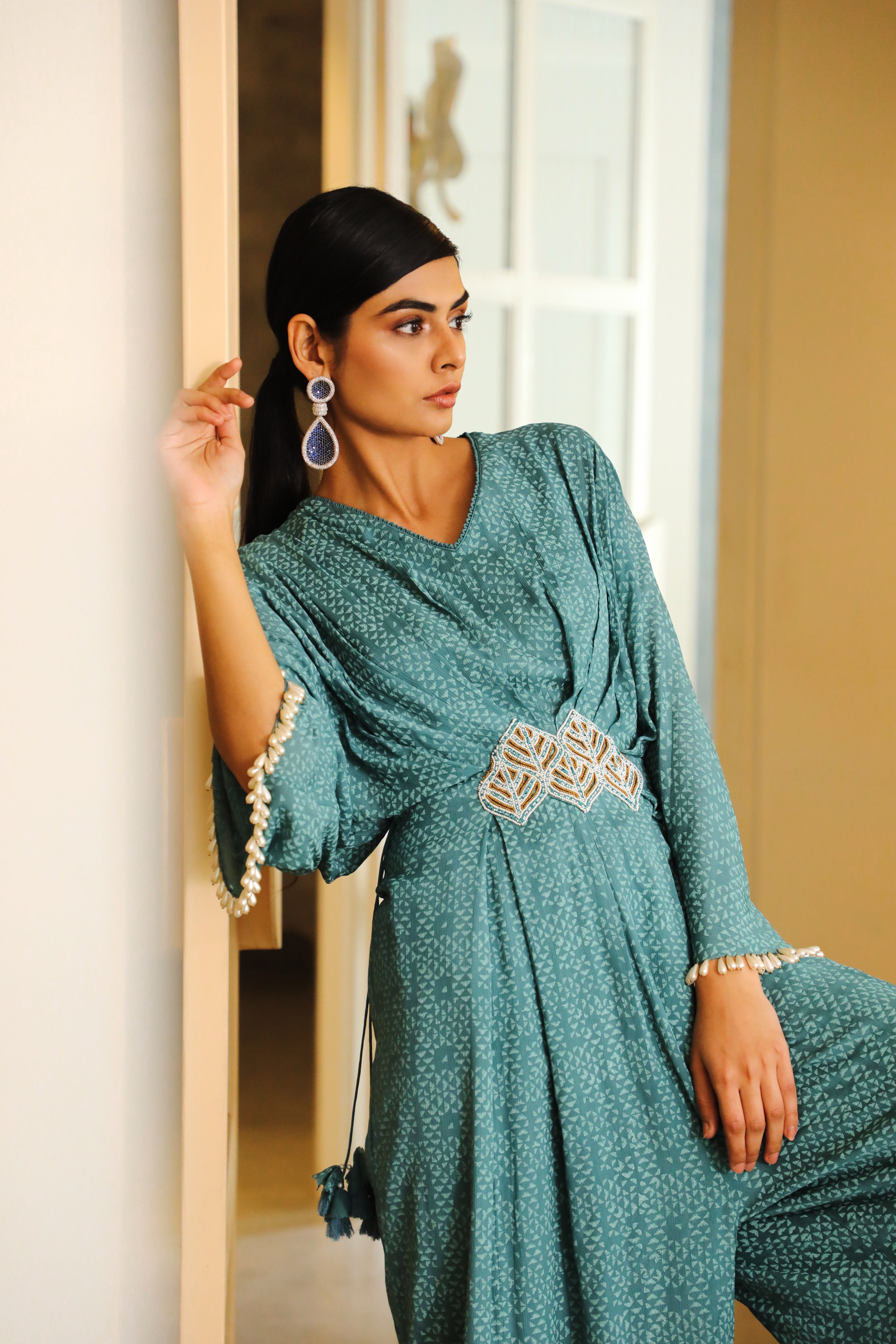 Featuring a teal blue pleated jumpsuit in chiffon and net base with hand block print. It is paired with a matching embroidered belt.
