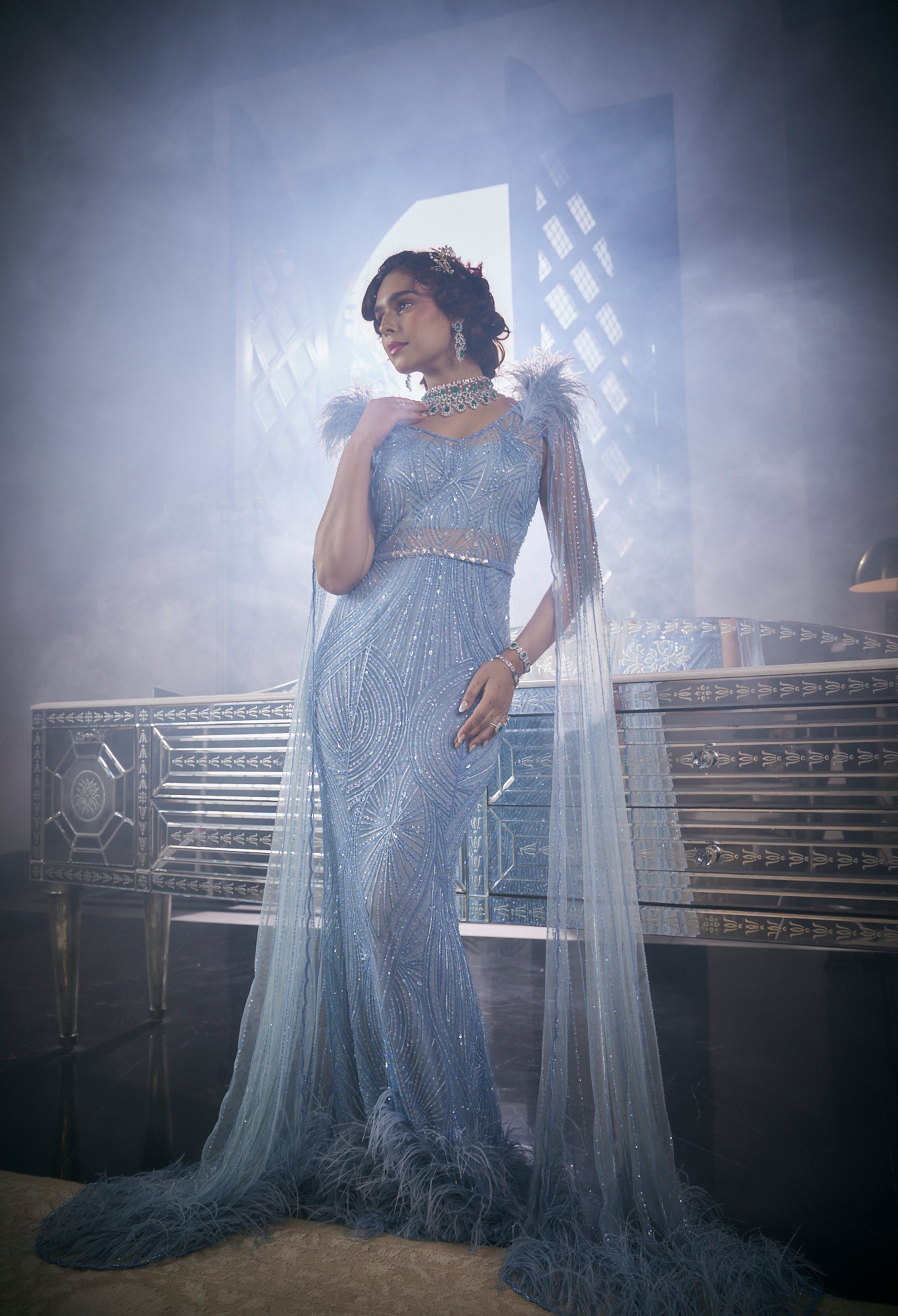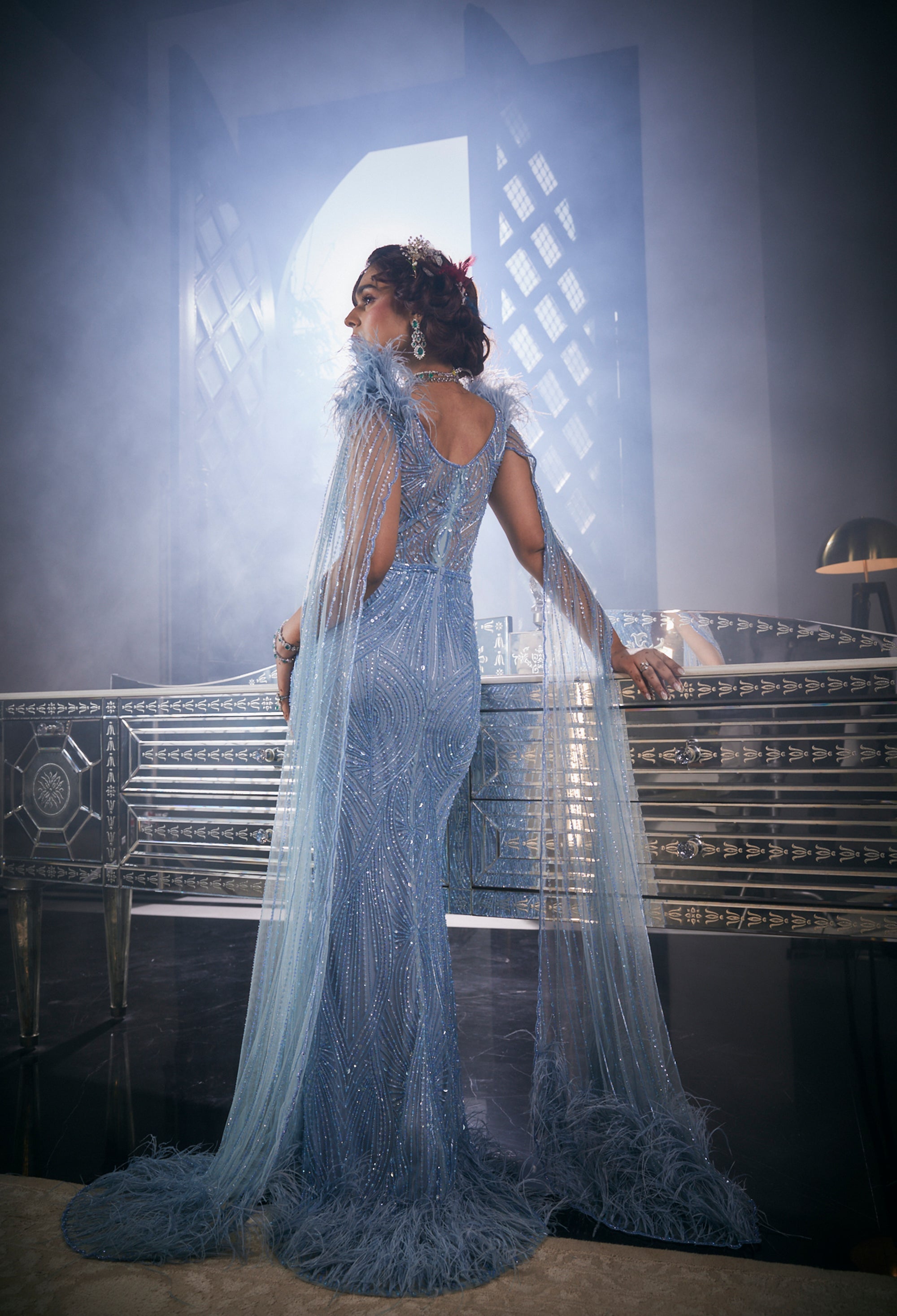 Make a regal entrance in this stunning blue gown, featuring long, dramatic sleeves and luxurious fur accents on the shoulders, perfectly complemented by intricate embroidery that adds a touch of whimsy and wonder.