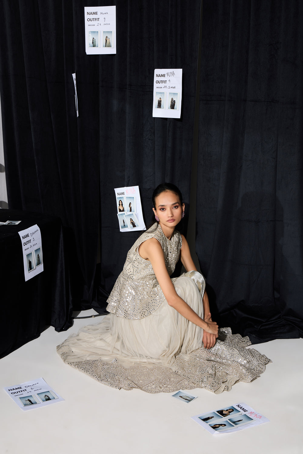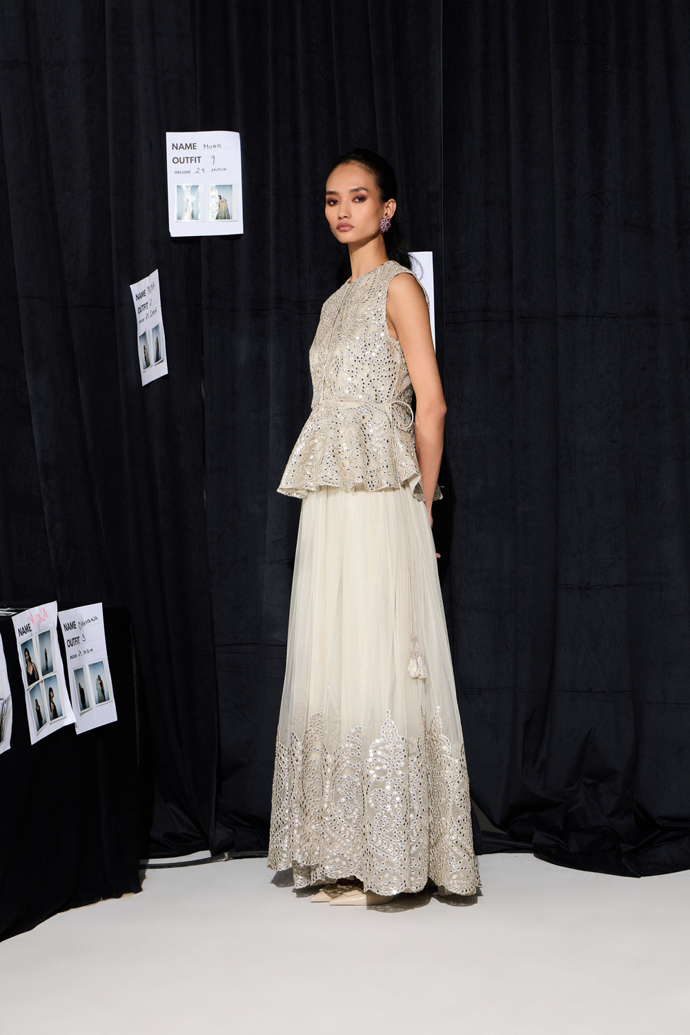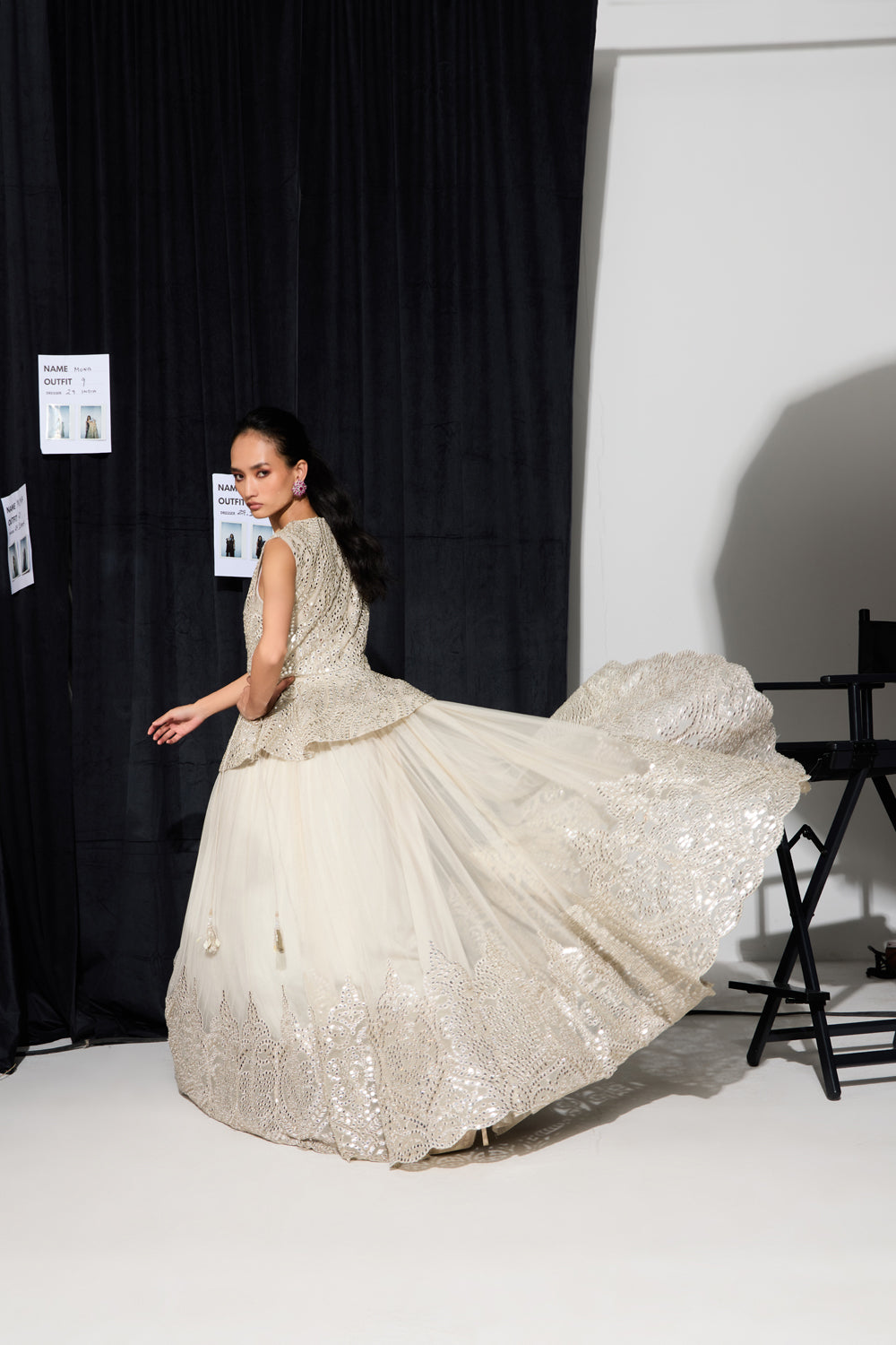 Elegance personified, this stunning long dress with intricate appliqué mirrorwork matching peplum jacket.