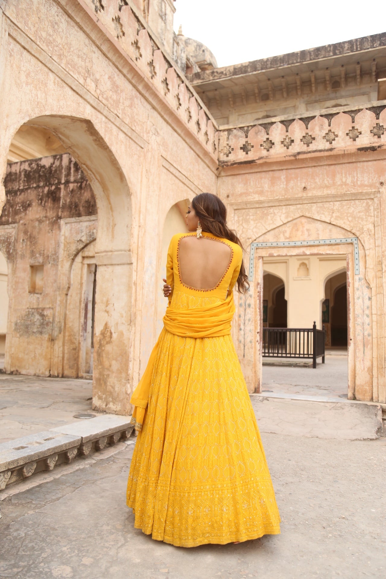 Featuring a ochre coloured lucknowi anarkali with complimenting dupatta.