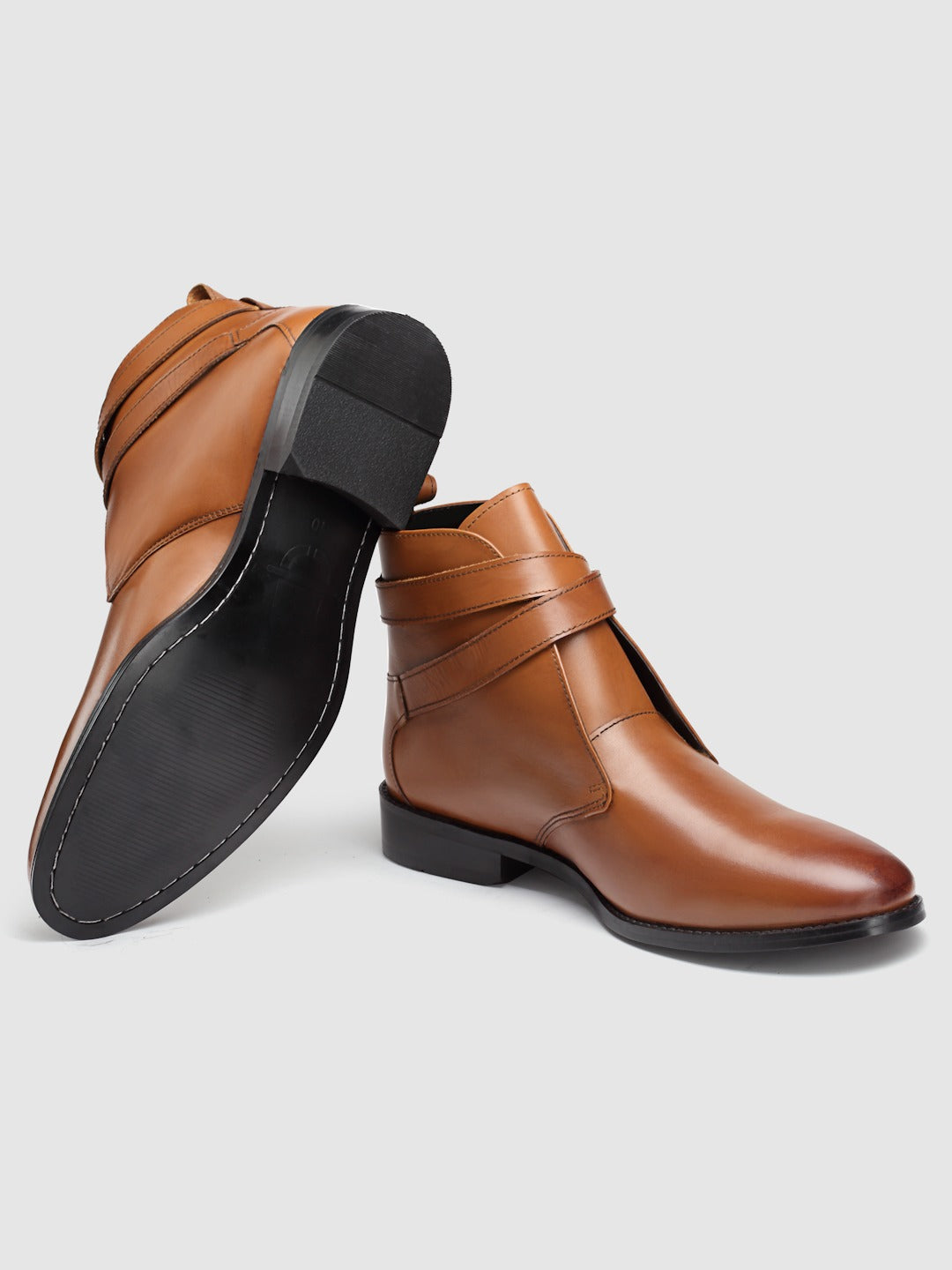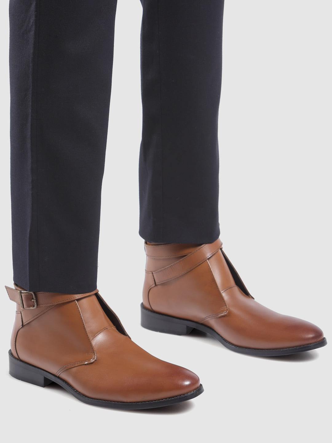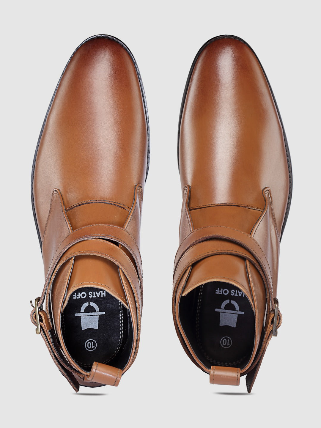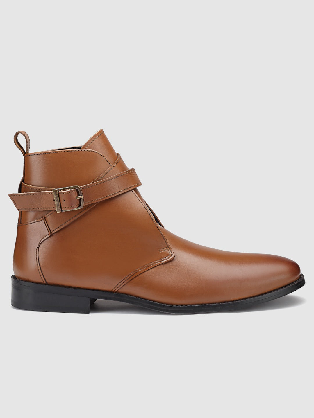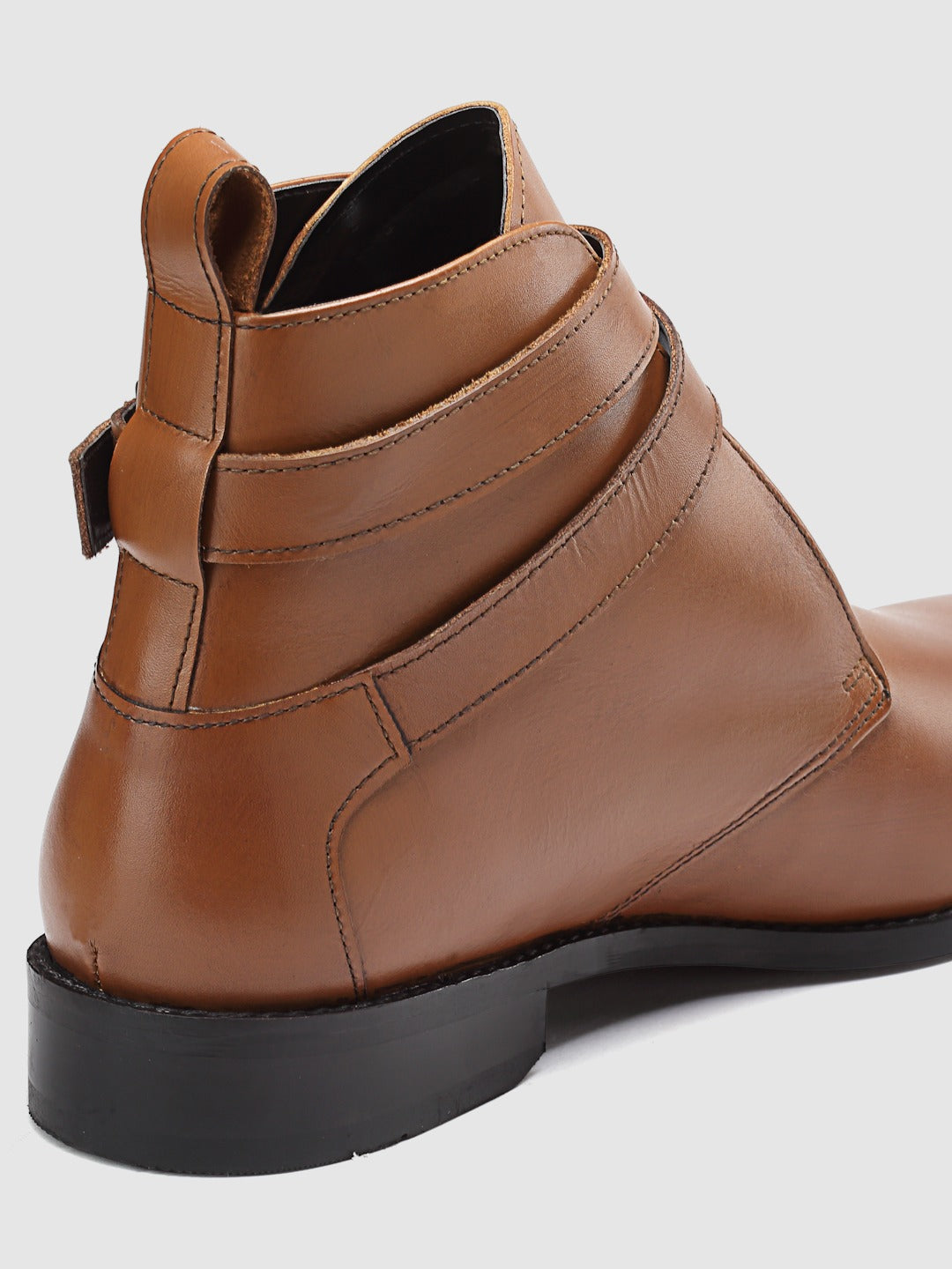 Mid Top Block-Heel Tan Leather Regular Boots With Buckle