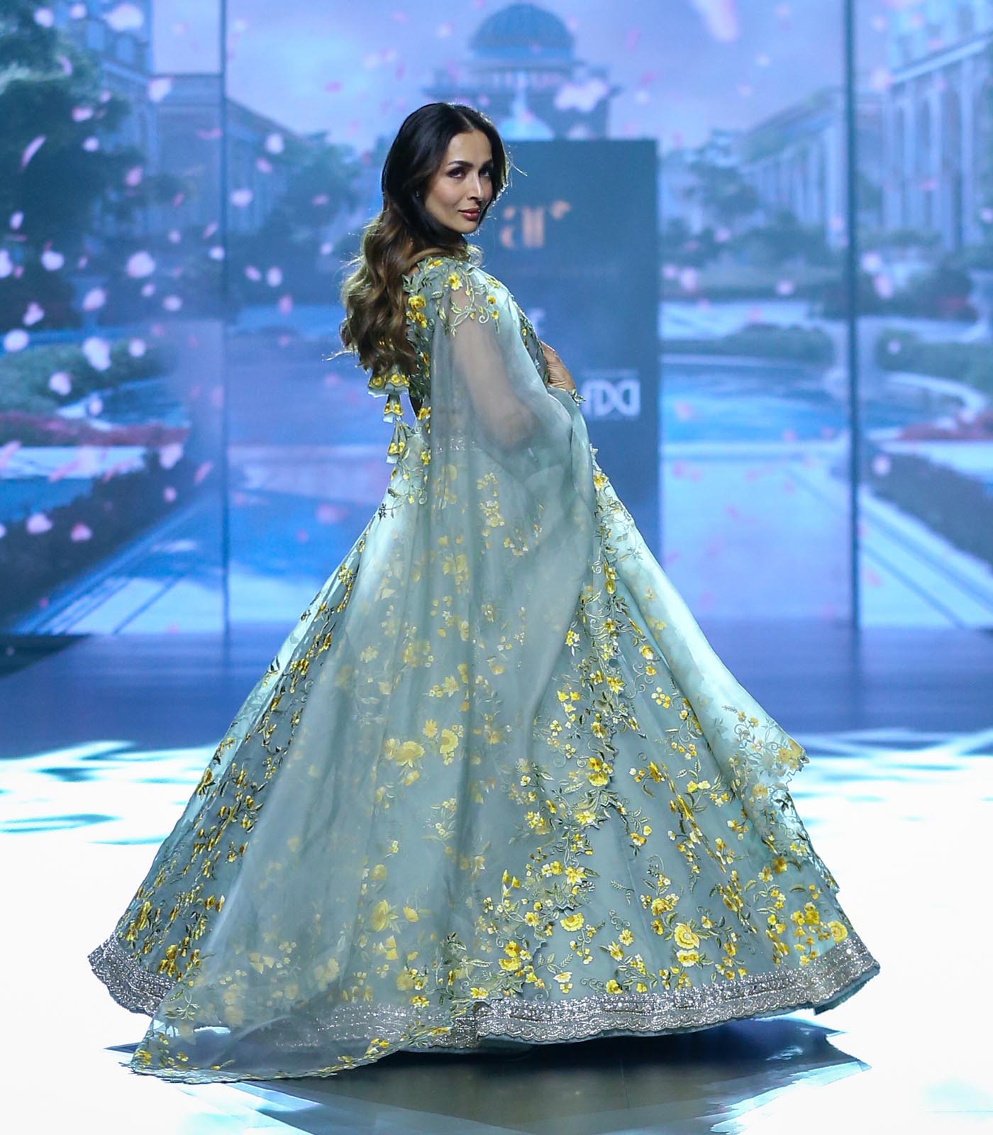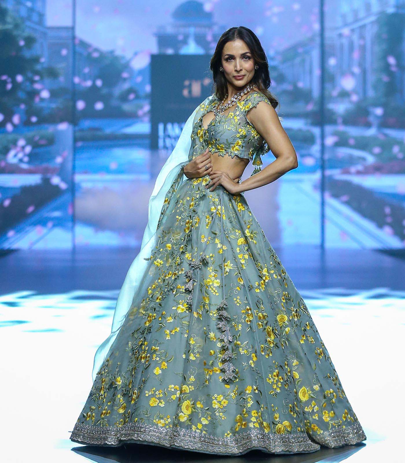 Sea blue organza yellow thread floral embroidered zardozi border "Nilufer" lehenga with cutwork blouse and dupatta.