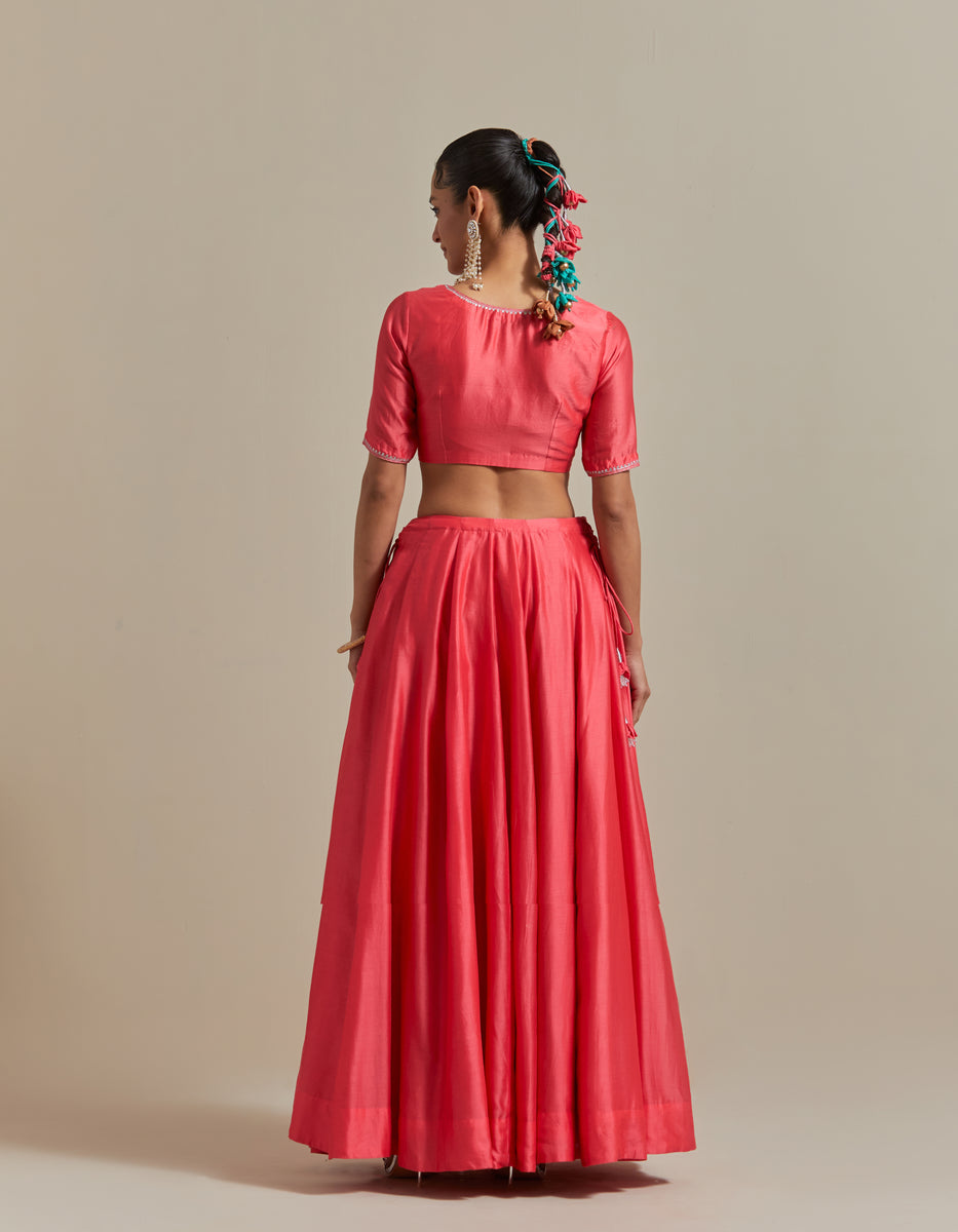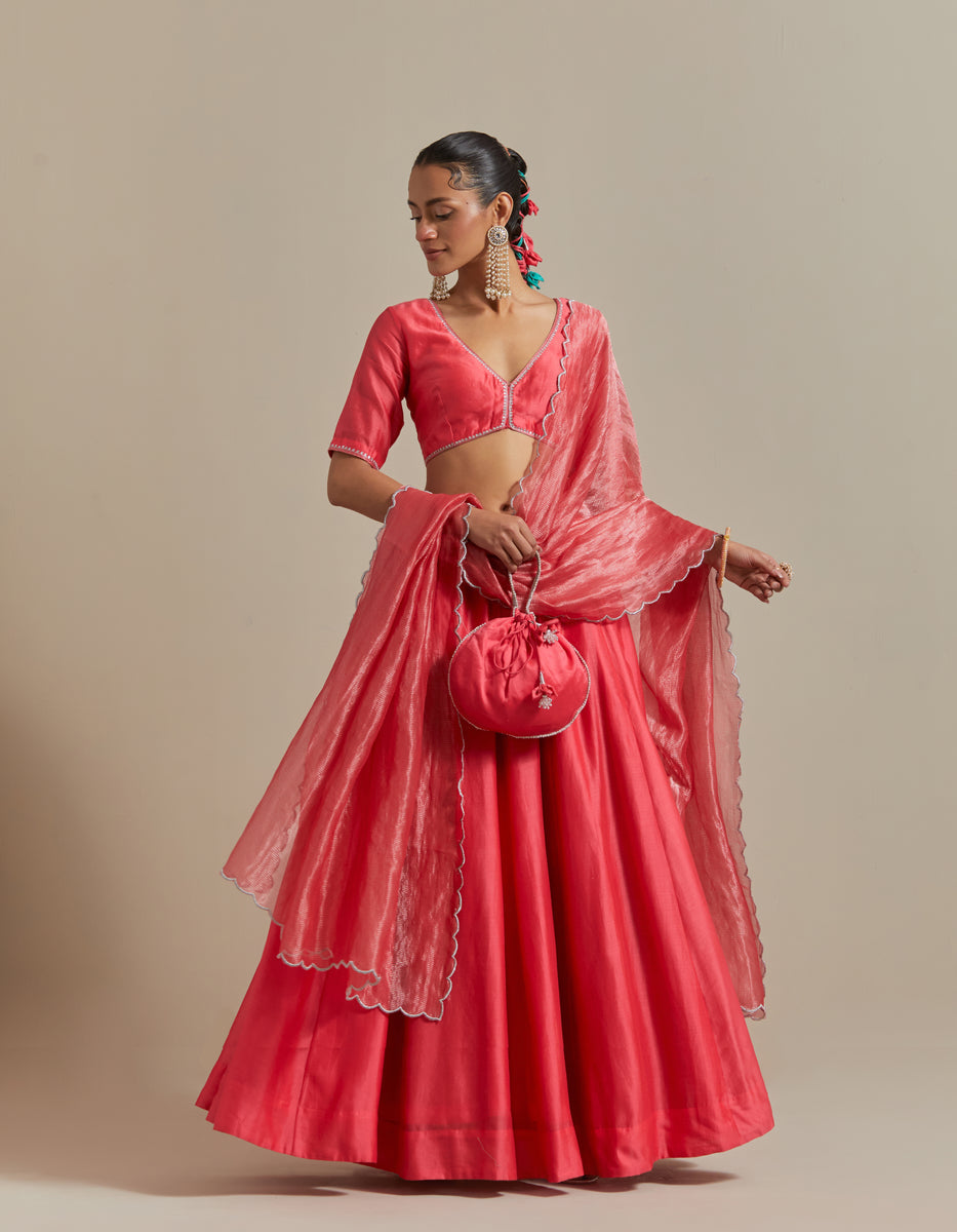 The embroidered panelled chanderi skirt features adjustable side strings for a customizable fit and tassels that add a touch of elegance and style. It comes with an embroidered v-neck blouse that has a front hook opening paired with the silver-striped scallop embroidered dupatta, making it perfect for festive occasions or formal events.