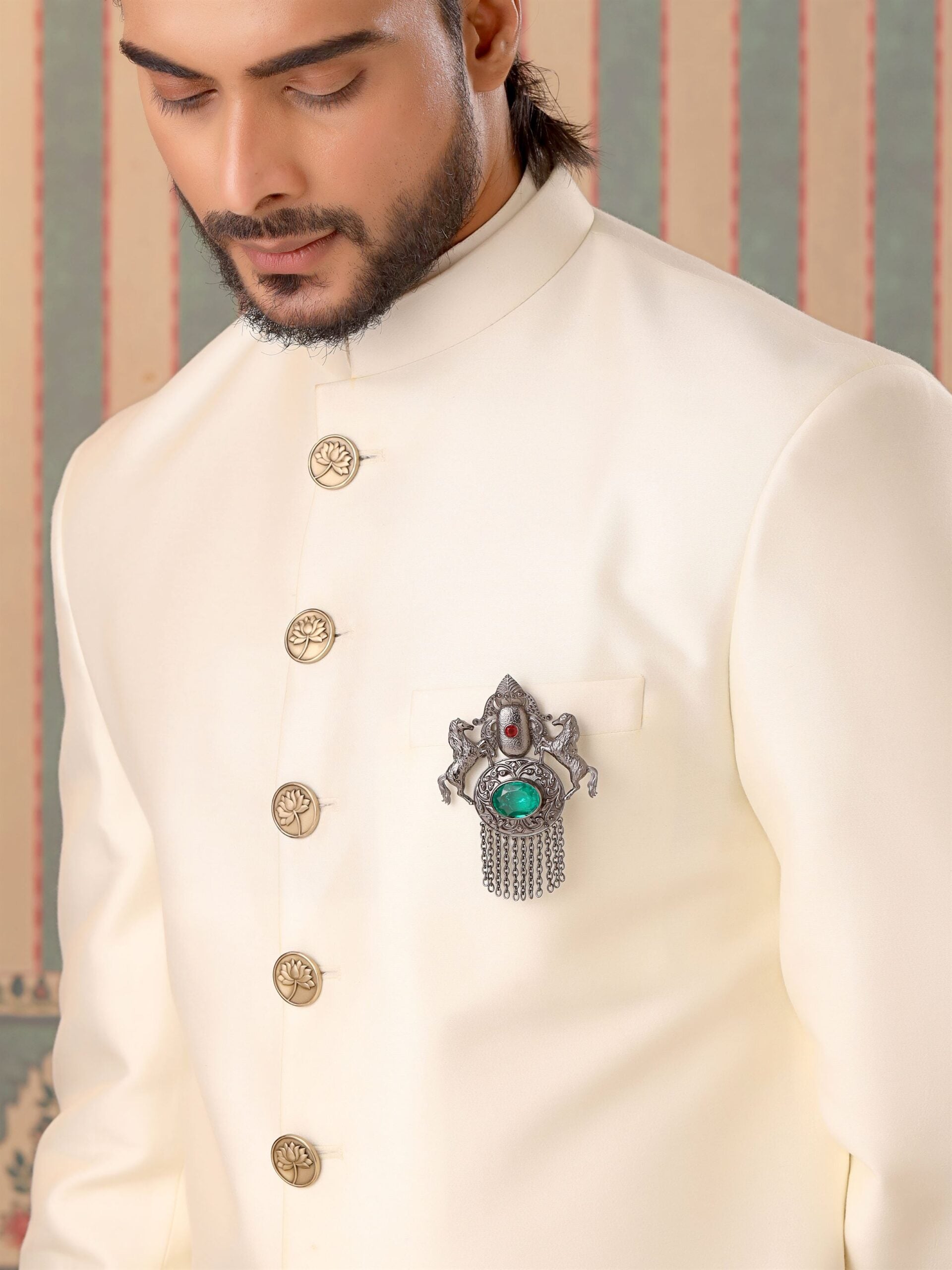 Sawaar-e-noor is a majestic accessory that embodies the spirit of untamed masculinity and impeccable style. This exquisite brooch features two magnificent stallions designed with a lustrous shimmer that catches every eye in the room. Crafted with attention to detail and adorned with glistening crystals, it exudes a captivating charm that sets you apart from the herd. Whether you're dressed for a formal occasion or adding flair to everyday wear, this brooch is the epitome of bold elegance for the modern stallion.