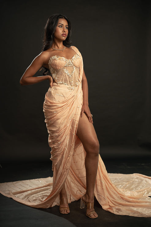 This baby peach pre-draped saree is a vision of elegance, crafted from Linen Satin fabric that glimmers with every movement. Paired with a Net blouse, the ensemble radiates sophistication and charm. The intricately hand-embroidered blouse adds a touch of glamour, making it perfect for a cocktail or reception, whether for the bride or her bridesmaids. With its timeless allure and delicate detailing, this saree is sure to captivate attention and leave a lasting impression on any special occasion.