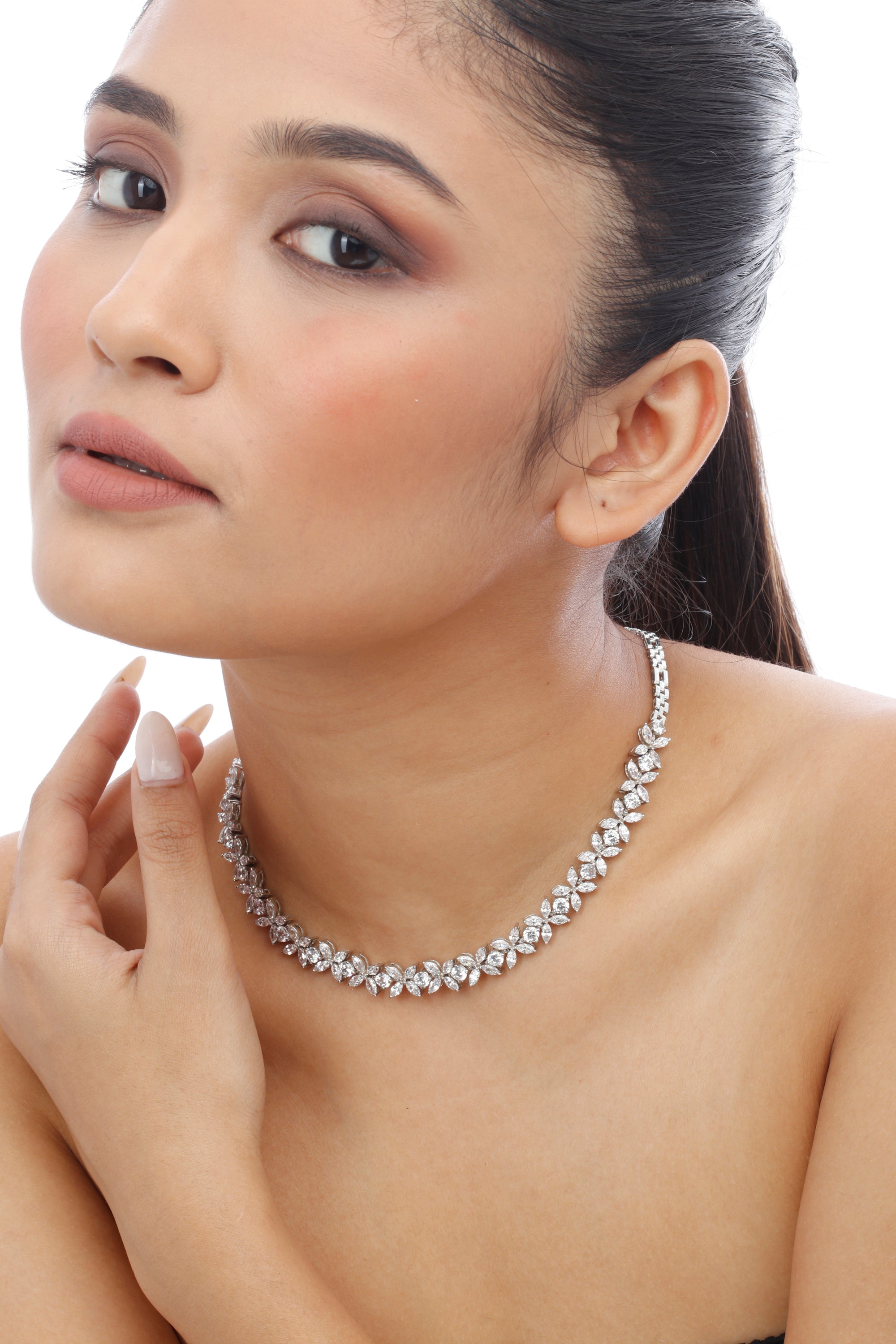Exude timeless elegance and sophistication with this exquisite floral Swarovski choker necklace, meticulously crafted to adorn your neckline with grace and charm. Inspired by the beauty of nature, this necklace features a delicate floral design adorned with shimmering pear-shaped Swarovski stones.