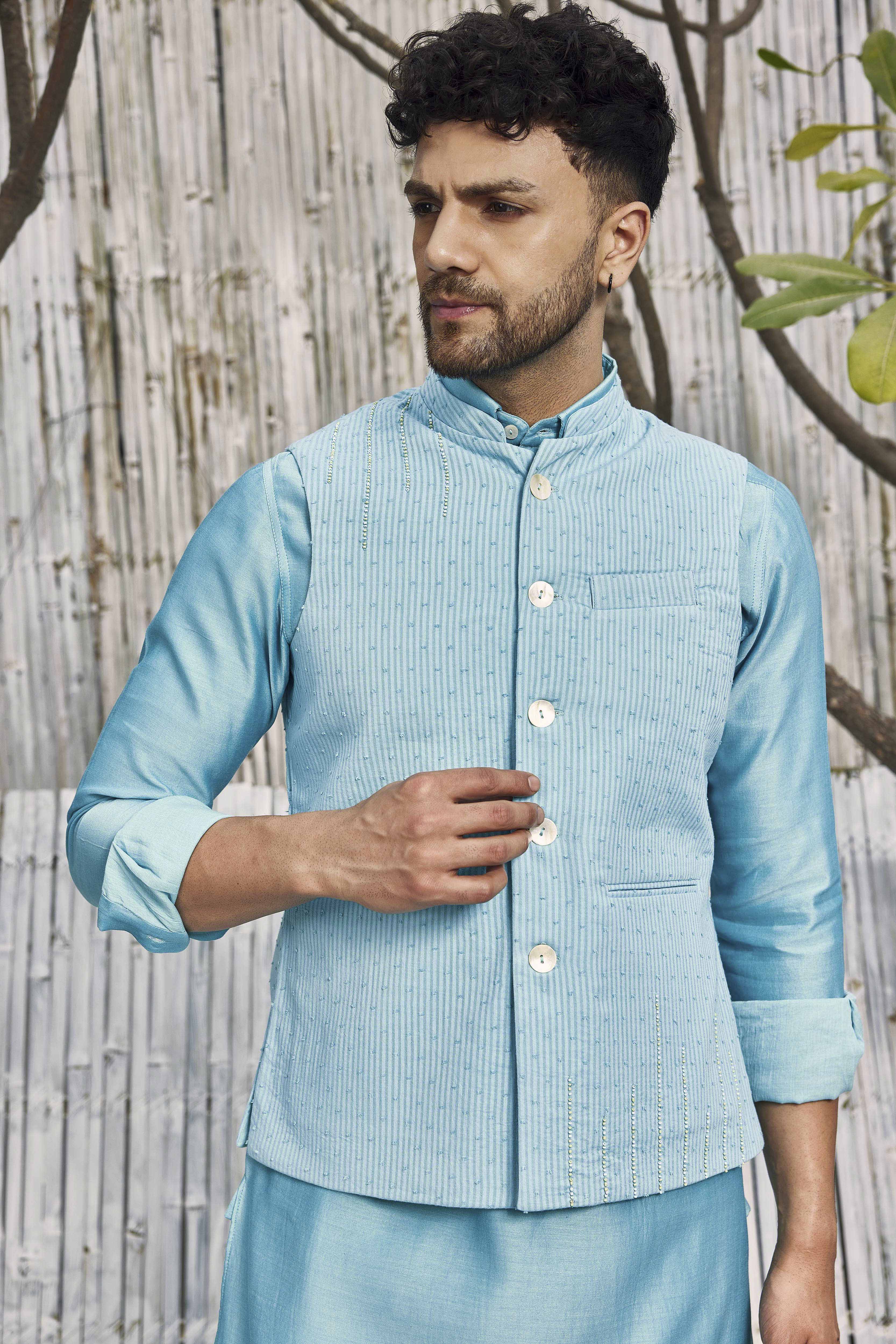 Bundi jacket in blue cotton dobby can transform any outfit into occasion wear.This jacket has an intricate dash of bead work over the right shoulder & left under pocket.