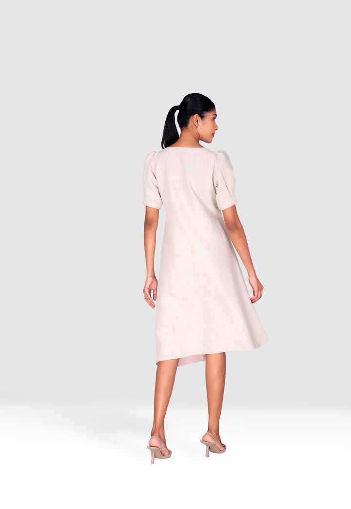 Peering from the edges of luxurious linen is a stunning presentation of dainty vines- hand-screen printed; accentuated with strokes of gold using heat press craft- letting you and your style shine with gleaming brilliance all day long. Available in a stunning high-low asymmetric silhouette that sensually curves around your body and in alluring shades of shadow blue, iron and natural.