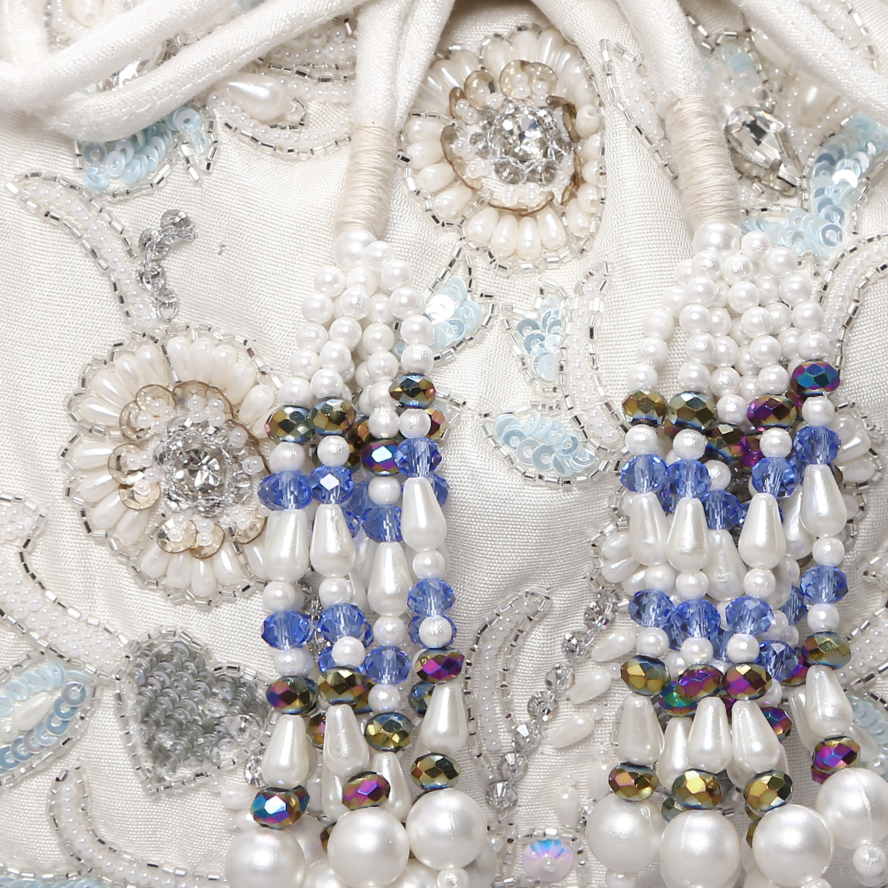 Our Aparajita (meaning something you can t win) potli named after the beautiful blue flower. here to win your hearts with its baroque embroidery with the dynamic dual embroidery of Aari and Zardosi work running through its surface of dupion silk. It will definitely draw any crowd towards it. The silver toned metal chain sling adds to its chic look.